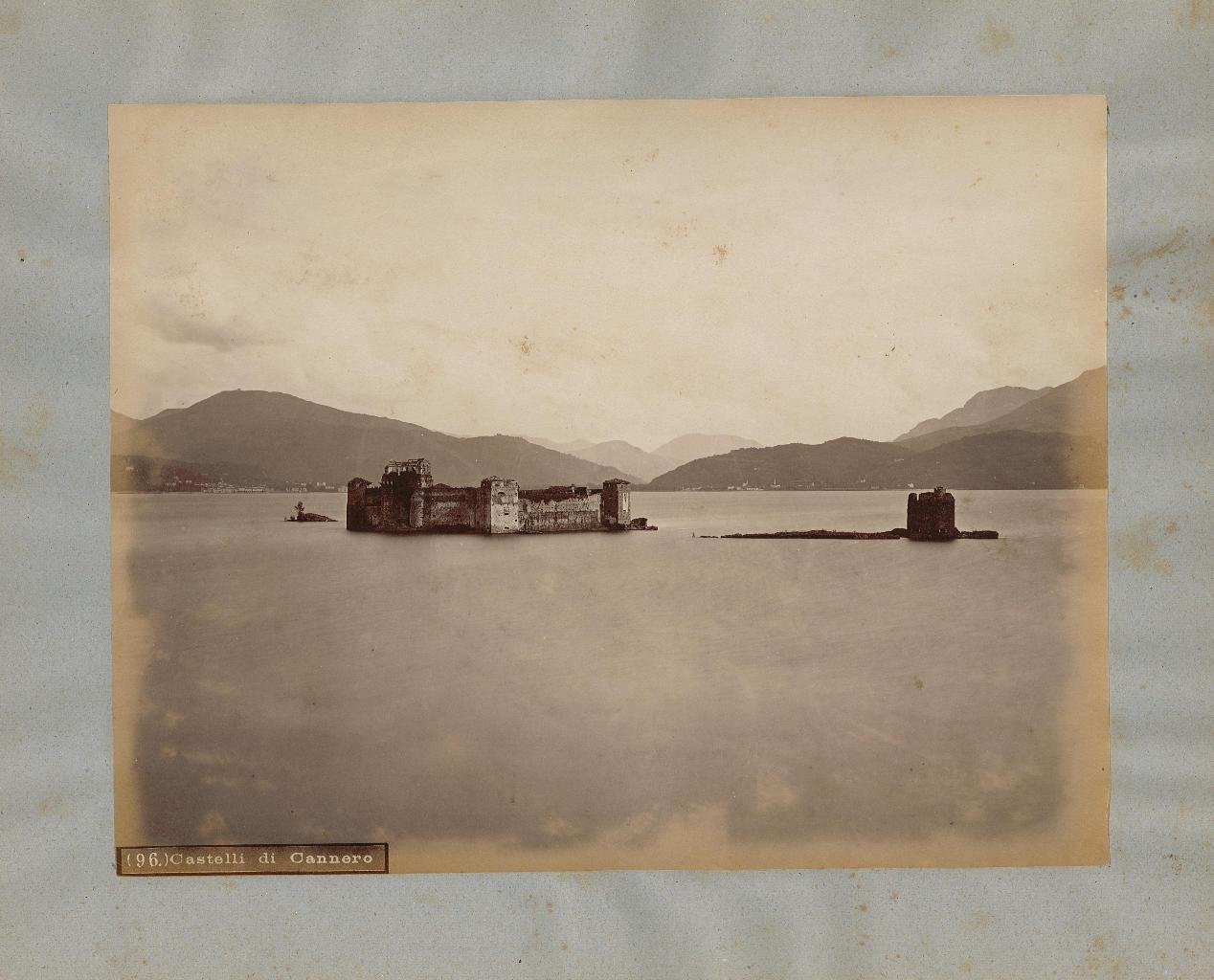 Fotografia all'albumina, antica ed originale, che riprende i Castelli di Cannero sul Lago Maggiore. La foto, di autore anonimo, databile 1880 ca, di mm 195x250 è applicata editorialmente su cartoncino coevo di mm 280x300. In basso a sinistra il titolo "(96) Castelli di Cannero"