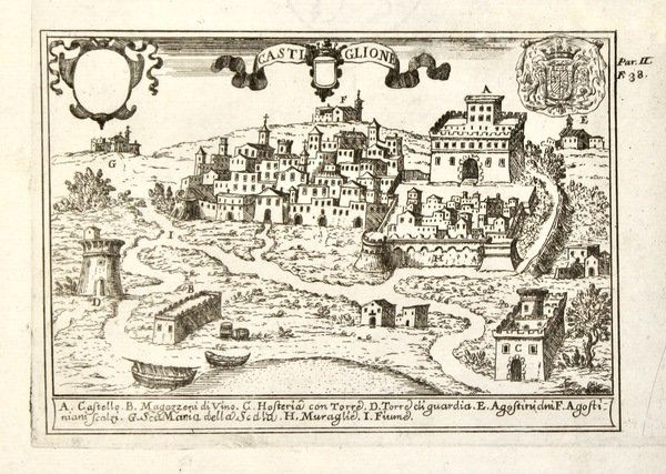 Incisione in rame, 125x180. Piacevole veduta arricchita da titolo su nastro e cartiglio, con richiami nella parte inferiore; tratta da " Il Regno di Napoli in prospettiva". Buon esemplare.