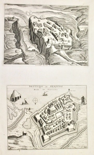Due incisioni in rame su un foglio, ognuna 205x272. Vedute prospettiche della città tratte da “Novum Italiae Theatrum”. Mortier, editore attivo ad Amsterdam ad inizio secolo, ristampò il “Theatrum Civitatum…Italiae” di Blaeu del 1663 aggiungendovi un quarto volume, relativo a nord Italia e Toscana. Ottimo esemplare.