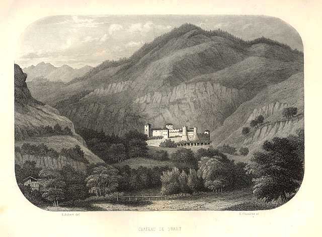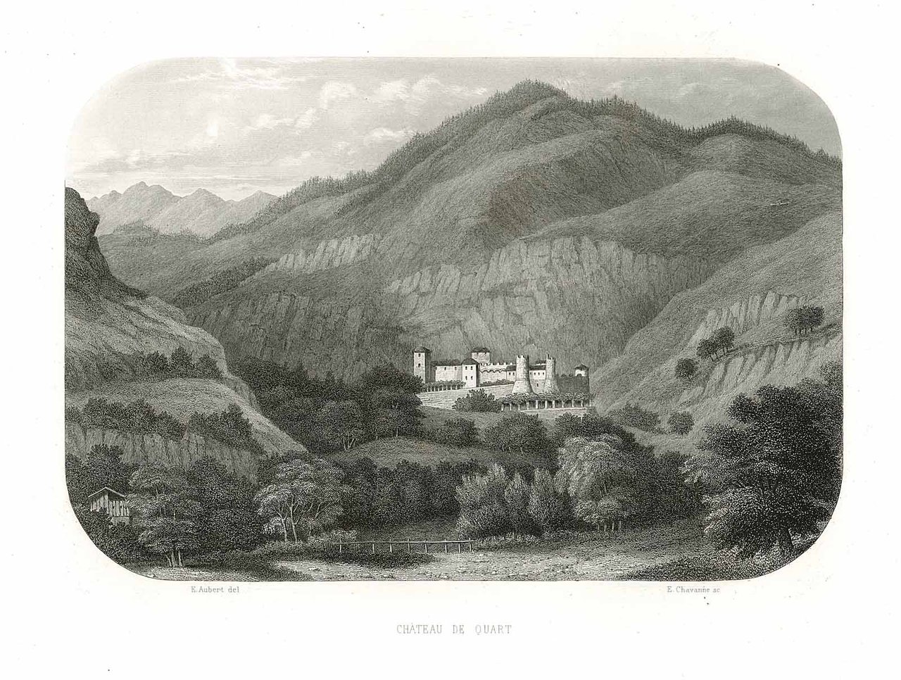 Stampa, antica ed originale, del Castello. Tratta dall'opera "La Vallée d'Aoste de Edouard Aubert" edita a Parigi da Amyot. Autore: Aubert E. del. - E. Chavanne sc. Luogo: Valle d'Aosta. Anno: 1860. Tecnica: incisione in acciaio. Dimensioni: 146x215 mm