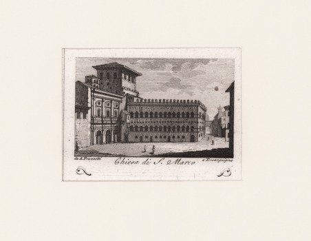 Veduta tratta dalla celebre Raccolta di num. 320 Vedute sì antiche, che moderne della città di Roma. …Incise a bulino in N. 80 rami, In Roma Nella Calcografia di Agapito Franzetti a Torsanguigna Col Permesso. ' L’opera si compone di un frontespizio calcografico e di 80 tavole numerate, ognuna composta da quattro vedute. Viene stampata senza data; molti repertori la datano intorno al 1790 circa, forse perché stampata su carta vergata. Una datazione intorno al 1800 ci sembra tuttavia più plausibile. ' Agapito Franzetti, calcografo attivo a Roma con bottega tra via del Corso e Torsanguigna, è noto per le sue piccole incisioni di veduta che servivano spesso come biglietti da visita. Tutte contengono, infatti, una linea in basso, dove si poteva apporre il proprio nome ad inchiostro. Come indicato nel titolo, le vedute raffigurano sia monumenti e antiche rovine che vedute “moderne”, con piazze, chiese e ville. Ciascuna tavola reca, in basso al centro, il nome dell’incisore. Gli artisti coinvolti sono sei: Jean-Jerome Baugean; Antonio Giuseppe Barbazza; Giovanni Battista Cipriani; Francesco Morelli; Antonio Poretta e Domenico Pronti. Molte delle vedute derivano dalla celebre opera di Giuseppe Vasi, Delle magnificenze di Roma antica e moderna. Pubblicata in 10 volumi dal 1747 al 1761, l’opera presenta 238 incisioni in rame, ciascuna incisione con testo narrativo che fornisce informazioni storiche e documentarie. ' Acquaforte, in buono stato di conservazione. ' Bibliografia: A. Bertarelli, H. Prior, Il biglietto da visita italiano. Contributo alla storia del costume e dell'incisione nel secolo XVII, Bergamo 1911, p. 162. View of the city printed in Rome by the publisher Agapito Franzetti. Taken from Raccolta di num. 320 Vedute sì antiche, che moderne della città di Roma. …Incise a bulino in N. 80 rami, In Roma Nella Calcografia di Agapito Franzetti a Torsanguigna Col Permesso. ' The work consists of an intaglio frontispiece and 80 numbered plates, each consisting of four views. It is printed without date; many repertories date it around 1790, perhaps because it was printed on laid paper. A date around 1800 seems more plausible. Franzetti, a chalcographer working in Rome with a workshop between Via del Corso and Torsanguigna, is known for his small engravings of views that were often used as business cards. They all contain a line at the bottom where one's name could be written in ink. The small views were often printed four to a sheet. As indicated in the title, the views depict both monuments and ancient ruins and "modern" views, with squares, churches and villas. Each table bears, at the bottom center, the name of the engraver. There are six artists involved: Jean-Jerome Baugean; Antonio Giuseppe Barbazza; Giovanni Battista Cipriani; Francesco Morelli; Antonio Poretta and Domenico Pronti. ' The views are made after Giuseppe Vasi’s monumental work Delle magnificenze di Roma antica e moderna. Published in 10 volumes from 1747 to 1761, the work features 238 copper engravings, each engraving with a narrative text that provides historical and documentary information. ' Bibliografia: A. Bertarelli, H. Prior, Il biglietto da visita italiano. Contributo alla storia del costume e dell'incisione nel secolo XVII, Bergamo 1911, p. 162. Cfr.