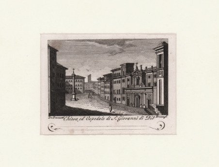 Veduta tratta dalla celebre Raccolta di num. 320 Vedute sì antiche, che moderne della città di Roma. …Incise a bulino in N. 80 rami, In Roma Nella Calcografia di Agapito Franzetti a Torsanguigna Col Permesso. ' L’opera si compone di un frontespizio calcografico e di 80 tavole numerate, ognuna composta da quattro vedute. Viene stampata senza data; molti repertori la datano intorno al 1790 circa, forse perché stampata su carta vergata. Una datazione intorno al 1800 ci sembra tuttavia più plausibile. ' Agapito Franzetti, calcografo attivo a Roma con bottega tra via del Corso e Torsanguigna, è noto per le sue piccole incisioni di veduta che servivano spesso come biglietti da visita. Tutte contengono, infatti, una linea in basso, dove si poteva apporre il proprio nome ad inchiostro. Come indicato nel titolo, le vedute raffigurano sia monumenti e antiche rovine che vedute “moderne”, con piazze, chiese e ville. Ciascuna tavola reca, in basso al centro, il nome dell’incisore. Gli artisti coinvolti sono sei: Jean-Jerome Baugean; Antonio Giuseppe Barbazza; Giovanni Battista Cipriani; Francesco Morelli; Antonio Poretta e Domenico Pronti. Molte delle vedute derivano dalla celebre opera di Giuseppe Vasi, Delle magnificenze di Roma antica e moderna. Pubblicata in 10 volumi dal 1747 al 1761, l’opera presenta 238 incisioni in rame, ciascuna incisione con testo narrativo che fornisce informazioni storiche e documentarie. ' Acquaforte, in buono stato di conservazione. ' Bibliografia: A. Bertarelli, H. Prior, Il biglietto da visita italiano. Contributo alla storia del costume e dell'incisione nel secolo XVII, Bergamo 1911, p. 162. View of the city printed in Rome by the publisher Agapito Franzetti. Taken from Raccolta di num. 320 Vedute sì antiche, che moderne della città di Roma. …Incise a bulino in N. 80 rami, In Roma Nella Calcografia di Agapito Franzetti a Torsanguigna Col Permesso. ' The work consists of an intaglio frontispiece and 80 numbered plates, each consisting of four views. It is printed without date; many repertories date it around 1790, perhaps because it was printed on laid paper. A date around 1800 seems more plausible. Franzetti, a chalcographer working in Rome with a workshop between Via del Corso and Torsanguigna, is known for his small engravings of views that were often used as business cards. They all contain a line at the bottom where one's name could be written in ink. The small views were often printed four to a sheet. As indicated in the title, the views depict both monuments and ancient ruins and "modern" views, with squares, churches and villas. Each table bears, at the bottom center, the name of the engraver. There are six artists involved: Jean-Jerome Baugean; Antonio Giuseppe Barbazza; Giovanni Battista Cipriani; Francesco Morelli; Antonio Poretta and Domenico Pronti. ' The views are made after Giuseppe Vasi’s monumental work Delle magnificenze di Roma antica e moderna. Published in 10 volumes from 1747 to 1761, the work features 238 copper engravings, each engraving with a narrative text that provides historical and documentary information. ' Bibliografia: A. Bertarelli, H. Prior, Il biglietto da visita italiano. Contributo alla storia del costume e dell'incisione nel secolo XVII, Bergamo 1911, p. 162. Cfr.