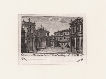 Veduta tratta dalla celebre Raccolta di num. 320 Vedute sì antiche, che moderne della città di Roma. …Incise a bulino in N. 80 rami, In Roma Nella Calcografia di Agapito Franzetti a Torsanguigna Col Permesso. ' L’opera si compone di un frontespizio calcografico e di 80 tavole numerate, ognuna composta da quattro vedute. Viene stampata senza data; molti repertori la datano intorno al 1790 circa, forse perché stampata su carta vergata. Una datazione intorno al 1800 ci sembra tuttavia più plausibile. ' Agapito Franzetti, calcografo attivo a Roma con bottega tra via del Corso e Torsanguigna, è noto per le sue piccole incisioni di veduta che servivano spesso come biglietti da visita. Tutte contengono, infatti, una linea in basso, dove si poteva apporre il proprio nome ad inchiostro. Come indicato nel titolo, le vedute raffigurano sia monumenti e antiche rovine che vedute “moderne”, con piazze, chiese e ville. Ciascuna tavola reca, in basso al centro, il nome dell’incisore. Gli artisti coinvolti sono sei: Jean-Jerome Baugean; Antonio Giuseppe Barbazza; Giovanni Battista Cipriani; Francesco Morelli; Antonio Poretta e Domenico Pronti. Molte delle vedute derivano dalla celebre opera di Giuseppe Vasi, Delle magnificenze di Roma antica e moderna. Pubblicata in 10 volumi dal 1747 al 1761, l’opera presenta 238 incisioni in rame, ciascuna incisione con testo narrativo che fornisce informazioni storiche e documentarie. ' Acquaforte, in buono stato di conservazione. ' Bibliografia: A. Bertarelli, H. Prior, Il biglietto da visita italiano. Contributo alla storia del costume e dell'incisione nel secolo XVII, Bergamo 1911, p. 162. View of the city printed in Rome by the publisher Agapito Franzetti. Taken from Raccolta di num. 320 Vedute sì antiche, che moderne della città di Roma. …Incise a bulino in N. 80 rami, In Roma Nella Calcografia di Agapito Franzetti a Torsanguigna Col Permesso. ' The work consists of an intaglio frontispiece and 80 numbered plates, each consisting of four views. It is printed without date; many repertories date it around 1790, perhaps because it was printed on laid paper. A date around 1800 seems more plausible. Franzetti, a chalcographer working in Rome with a workshop between Via del Corso and Torsanguigna, is known for his small engravings of views that were often used as business cards. They all contain a line at the bottom where one's name could be written in ink. The small views were often printed four to a sheet. As indicated in the title, the views depict both monuments and ancient ruins and "modern" views, with squares, churches and villas. Each table bears, at the bottom center, the name of the engraver. There are six artists involved: Jean-Jerome Baugean; Antonio Giuseppe Barbazza; Giovanni Battista Cipriani; Francesco Morelli; Antonio Poretta and Domenico Pronti. ' The views are made after Giuseppe Vasi’s monumental work Delle magnificenze di Roma antica e moderna. Published in 10 volumes from 1747 to 1761, the work features 238 copper engravings, each engraving with a narrative text that provides historical and documentary information. ' Bibliografia: A. Bertarelli, H. Prior, Il biglietto da visita italiano. Contributo alla storia del costume e dell'incisione nel secolo XVII, Bergamo 1911, p. 162. Cfr.