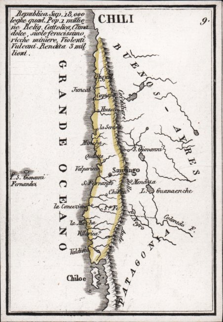Rara mappa in miniatura tratta dal ' Piccolo Atlante per la Gioventù composte di 40 tavole geografiche con la descrizione delle Superficie, popolazioni, religioni, forma di governo, rendite, armate, ed altre notizie storico statistiche ' di Pietro e Giuseppe Vallardi, stampato a Milano, senza data, ma circa 1830. L'atlante consiste in un titolo e quaranta mappe stampate su carta spessa. Le carte sono divise in quattro serie: Europa, Asia, America e Africa; ogni set contiene nove mappe regionali dei paesi più importanti. Come dice il titolo, ogni mappa fornisce informazioni su geografia, popolazione, religione, governo, entrate e forza militare. Anche se l'atlante non è datato, una data approssimativa può essere accertata dalla mappa di Argentina e Uruguay. Sulla mappa l'Argentina è chiamata ' 'Confederazione del Rio della Plata'. Le Province Unite del Rio de la Plata era il nome iniziale per la nuova Argentina indipendente. Il nome fu abbandonato alla fine del terzo decennio in favore di Argentina. La mappa mostra anche un Uruguay indipendente, quindi dopo il Trattato di Montevideo del 1828. I Vallardi erano una famiglia di rinomati editori milanesi. Al capostipite Francesco (1736-1799) succedettero i figli Pietro, Santo Francesco, Giuseppe e Cesare Paolo. Nel 1812 rimasero in società Pietro (1770-1819) e Giuseppe (1784-1861), che intitolarono (1812) la ditta ai ' Fratelli Vallardi ' distinguendosi nella pubblicazione di libri e stampe d'arte. Dal 1818 Giuseppe, rimasto unico proprietario, diede grande impulso anche al commercio calcografico. Acquaforte, coloritura coeva dei contorni, in ottimo stato di conservazione. Rare miniature map taken from the ' Piccolo Atlante per la Gioventu composte di 40 tavole geografiche con la descrizione delle Superficie, popolazioni, religioni, forma di governo, rendite, armate, ed altre notizie storico statistiche ' by Pietro & Giuseppe Vallardi, published in Milan, circa 1830. The atlas consists of a title and forty maps each printed on thick card. The cards are divided into four sets: Europe, Asia, America, and Africa; with each set containing nine regional maps of the most prominent countries. As the title states, each map gives information upon the geography, population, religion, government, revenues and military strength. ' Although the atlas is not dated, an approximate date maybe ascertained from the map of Argentina and Uruguay. Upon the map Argentina is named the ' ?‘Confederazione del Rio della Plata’. The United Provinces of Rio de la Plata was an early name for the newly independent Argentina. The name was dropped by the end of the 1820s in favour of Argentina. The map also shows an independent Uruguay, which gained its independence at the Treaty of Montevideo in 1828. The Vallardis were a family of renowned Milanese publishers. The progenitor Francesco (1736-1799) was succeeded by his sons Pietro, Santo Francesco, Giuseppe, and Cesare Paolo. In 1812 Pietro (1770-1819) and Giuseppe (1784-1861) remained in partnership, naming (1812) the firm the ' Fratelli Vallardi, distinguishing themselves in the publication of art books and prints. From 1818 Giuseppe, who remained the sole owner, also gave great impetus to the intaglio trade. Etching, contemporary coloring of the outlines, in very good condition. Cfr.