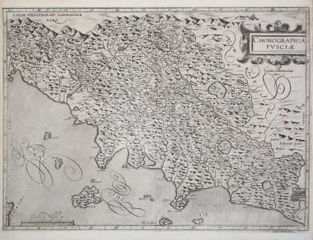 In alto a destra, in un cartiglio decorato, è inciso il titolo: ' CHOROGRAPHIA TUSCIAE. ' Sotto al cartiglio, si legge: ' Girolamo Bellarmato Senese Autore. In basso a sinistra, nel mare, è rappresentata la ' Scala di Miglia 30 ' (30 miglia = mm 82). In basso a destra, fuori dal margine graduato, è inciso l’imprint editoriale: ' Matteo Florimi formis. Orientazione nei quattro lati al centro con il nome dei punti cardinali: ' Septentrio, Meridies, Oriens, Occidens, il nord è in alto. Graduazione ai margini di 1’ in 1’, da 41° 30’ a 43° 26’ di latitudine e da 32° 34’ a 36° 24’ di longitudine. Nel 1600 circa, Matteo Florimi pubblicò questa carta della Toscana. Nell’iscrizione indica quale autore Girolamo Bellarmato, ma non sappiamo con certezza se il Florimi abbia preso a modello direttamente l’originale del Bellarmato del 1536 oppure, più probabilmente, una delle tante derivazioni successive. Questa tavola del Florimi, come sostiene Almagià, potrebbe essere stata incisa da Arnoldo de Arnoldi che, dopo aver lavorato a lungo con Giovanni Antonio Magini, passò a Siena nella bottega del Florimi proprio nel periodo 1600-1602. “La ' CHOROGRAPHIA TUSCIAE ' di Girolamo Bellarmato (o Bellarmati) rappresenta il prototipo della cartografia a stampa della regione. Di forma leggermente trapezoidale, è composta da quattro fogli uniti. Sebbene priva di scala grafica, dal valore dei gradi di latitudine possiamo ricostruire il valore della riduzione, pari a 1:325.000 circa. Nella lunga dedica a Valerio Orsini, generale dell’esercito dei Medici, l’autore specifica che la carta è utile per la professione sua presentandola perciò quale strumento ad uso militare, politico e amministrativo. Questo prodotto cartografico si basa su dati ricavati da una sistematica osservazione diretta, da misurazioni e rilievi effettuati dall’autore sul territorio. Viene data attenzione a tutti gli aspetti geografici; per i centri abitati la grandezza della raffigurazione è rapportata all’entità della popolazione. Molto curata l’idrografia, ben evidenziata l’orografia che è disegnata con dei coni, di maggiori dimensioni per i rilievi più importanti. Questo pregevole ed innovativo lavoro fu preso a modello per molti anni a seguire ed ebbe numerose derivazioni. Come osserva Biasutti (1908), anche Gastaldi utilizzò il rilievo del Bellarmato per comporre la sua carta della penisola (1561). L’opera costituisce altresì la base per le carte della regione che i fiamminghi Abraham Ortelius (1570) e Gerard Mercator (1587) inseriscono nei rispettivi atlanti. Della carta è oggi noto un solo esemplare, conservato all’Archivio di Stato di Firenze” (cfr. ' Cartografia e Topografia Italiana del XVI secolo ' p. 1961). Matteo Florimi (Polistena 1540 circa – Siena 1613) fu editore e commerciante di libri e di stampe. Di origini calabresi, si stabilì a Siena nel 1581, con un negozio in Banchi. L’attività calcografica di Matteo Florimi fu più volte affiancata da veri e propri maestri incisori come Cornelis Galle, Arnoldo degli Arnoldi, Pietro de Iode, Jan Sadeler e artisti come Francesco Vanni, Ventura Salimbeni e Alessandro Casolani, con i quali lo stampatore ha collaborato per la preparazione di soggetti sacri. L’attività cartografica del Florimi produsse stampe di moltissime città e territori di tutto il mondo, che non furono mai disegnati per lui, ma furono manipolazioni di rilievi già esistenti, o di carte edite da altri stampatori. Nella seconda metà del XVI secolo la curiosità geografica e il desiderio di viaggiare, erano molto sentiti, e il Florimi fu lungimirante nel dedicarsi alla produzione di vedute di città a volo d’uccello il più possibile fedeli, destinate a mostrare luoghi mai visti difficilmente visitabili. ' ' Il Florimi si inserì perfettamente in questo filone di mercato e contribuì al perfezionamento della nuova “ondata” di rappresentazioni cartografi che copiando alcune stampe di Antonio. On the upper right, in an ornate cartouche, is engraved the title: ' CHOROGRAPHIA TUSCIAE. ' Below the cartouche, it reads: ' Girolamo Bellarmato Senese Autore. At lower left, in the sea, is depicted the Scale of Mile 30 (30 miles = mm 82). At lower right, outside graduated margin, is engraved editorial imprint: ' Matteo Florimi formis. Orientation in the four sides in the center with the names of the cardinal points: ' Septentrio, Meridies, Oriens, Occidens, ' north is at the top. Graduation in the margins of 1' in 1', from 41° 30' to 43° 26' latitude and from 32° 34' to 36° 24' longitude. In about 1600, Matteo Florimi published this map of Tuscany. In the inscription he lists Girolamo Bellarmato as the author, but we do not know for sure whether Florimi directly modeled Bellarmato's 1536 original or, more likely, one of many later derivations. This map by Florimi, as Almagià argues, may have been engraved by Arnoldo de Arnoldi who, after working for a long time with Giovanni Antonio Magini, moved to Siena to Florimi's workshop precisely in the period 1600-1602. “Girolamo Bellarmato's (or Bellarmati's) ' CHOROGRAPHIA TUSCIAE ' represents the prototype of printed cartography of the region. Slightly trapezoidal in shape, it consists of four joined sheets. Although it lacks a graphic scale, from the value of degrees of latitude we can reconstruct the value of the reduction, which is about 1:325,000. In the long dedication to Valerio Orsini, general of the Medici army, the author specifies that the map is useful for his profession therefore presenting it as a tool for military, political and administrative use. This cartographic product is based on data derived from systematic direct observation, measurements and surveys made by the author on the territory. Attention is given to all geographical aspects; for population centers, the size of the depiction is related to the size of the population. The hydrography is very well taken care of, and the orography is 