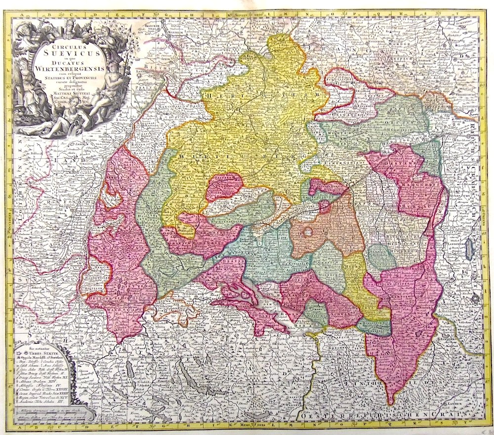 Incisione in rame, coloritura originale d'epoca ritoccata, con ricco e fascinoso cartiglio figurato in bianco nero in alto. Mm 495x575. Seutter, dopo un apprendistato presso Homann a Norimberga, trasferitosi ad Augsburg verso il 1710, aprì la propria attività superando il maestro sotto il profilo della bellezza: le sue carte hanno sempre colori brillanti e cartigli elaborati. Buon esemplare con tracce di umido visibili solo al verso<BR>Copperplate, original colour refreshed. Mm 495x575. Good condition with some damp stain visible mainly on verso. Seutter, one of the most celebrated eighteenth century German mapmakers, after having worked with Homann in Nuremberg, started his own business in Augsburg around 1710. His maps always have elaborate cartouches and are very decorative and printed on good paper. <BR>