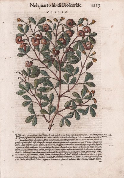 Opera tratta da ' I discorsi di M. Pietro Andrea Matthioli sanese, medico cesareo, et del serenissimo prencipe Ferdinando arcidvca d'Austria & c. Ne i sei Libri di Pedacio Dioscoride Anazarbeo della materia medicinale. ' Con dedica alla Principessa Giovanna, arciduchessa d’Austria (il Mattioli era medico reale), escono in volgare, nel 1568, i sei libri ' di nuovo dallo istesso autore ricorretti, & in più di mille luoghi aumentati. Con le figure grandi tutte di nuovo rifatte, & tirate dalle naturali & vive piante & animali, & in numero maggiore che le altre per avanti stampate. ' Lo stesso Pietro Andrea Mattioli presenta così la nuova edizione del libro, che già ha ricevuto molti consensi e che toccherà il culmine del successo grazie, appunto, alla forma di presentazione molto più organica, alla completezza delle informazioni, e, soprattutto, alla ricchezza e alla chiarezza delle illustrazioni. ' Chi sapesse tutte le virtù delle piante farebbe miracoli: questo enunciato dell’autore sembra animare per primo proprio lui, che va a cercare con certosina pazienza ogni minimo appiglio per lodare le virtù medicinali di ogni erba, raccontando ogni aneddoto, scoprendo ogni notizia curiosa, riportando ogni considerazione fatta sull’argomento da altri studiosi prima di lui. ' Il tono enciclopedico dell’opera si avverte, in maniera evidente, fin dalla dedica. Il discorrere dell’autore, le cui radici toscane o, per meglio dire, senesi non si smentiscono, è agile, piano, adatto ad un pubblico ampio, anche meno colto e poco preparato ma che, in qualche maniera, faceva parte del vasto mondo della medicina e della farmacia del tempo. Non è un caso che il testo sia tra quelli rimasti più a lungo in uso, anche nel piccolo bagaglio librario di famiglie povere o quasi analfabete. ' Alla sostanziosa dedica segue un proemio dedicato agli addetti ai lavori e le solite lettere di complimenti. Seguono due copiose tavole, cioè due indici: uno analitico per tutte le voci, l’altro per patologie. ' L’opera vera e propria inizia con il ritratto a piena pagina di Mattioli e illustra, in sequenza, le piante medicinali (concentrate nei primi quattro libri) e una serie di preparazioni (oli, unguenti, ecc.). Per Mattioli l’occasione è ghiotta sia per potersi dilungare sulla esatta identificazione delle specie, mostrando una vasta preparazione botanica, sia, soprattutto, per mostrare le splendide immagini delle piante, che, a volte, sono anche più di una per esemplare e messe a confronto, qualora il lettore avesse dubbi. Il secondo libro è dedicato in parte agli animali marini (ricci, spugne, seppie, pesci, ecc.) in parte a quelli terrestri (lepri, capriolo, castoreo, rospo, ecc.), comprese le vipere e le api con relativi prodotti (miele, cera, propoli, ecc.). Il quinto libro è dedicato ai minerali e il sesto ai veleni. ' Di ogni voce viene riportato il testo di Dioscoride tradotto in italiano, un esame moderno di identificazione con analogie e confronto dei pareri di autori diversi poi le virtù e i nomi in più lingue. ' Un’opera che ha lasciato il segno nella letteratura medica e farmaceutica del Rinascimento e che, ancora oggi, sprizza fascino ad ogni pagina. Plate taken from ' I discorsi di M. Pietro Andrea Matthioli sanese, medico cesareo, et del serenissimo prencipe Ferdinando arcidvca d'Austria & c. Ne i sei Libri di Pedacio Dioscoride Anazarbeo della materia medicinale ' printed in Venice by Vincenzo Valgrisi.Mattioli's Italian translation of the works of Dioscorides. ' Mattioli (1501-1577) was a Siennese doctor and naturalist. He described more than one hundred new plants and contributed to the development of medical botany. This, his most important work, was first printed in 1544 in Italian, 1554 in Latin, French in 1561, Czech in 1562, and in German in 1563. ' The wood cuts in his work were accurate and standardized enough to allow for easy identification. While nominally a commentary on the work of the botanist Dioscordies, Mattioli significantly expanded the work by adding major new contributions. He relied in part on the contributions of the Turkish diplomat, Buscecq, his doctor, Quakelbeen, and the famed botanist, Luca Ghini, who founded the botanical garden in Pisa. ' In this work, Mattioli significantly provided the first known observation of a tomato being grown and eaten in Italy.Woodcut with fine later hand colour, good condition. Cfr.