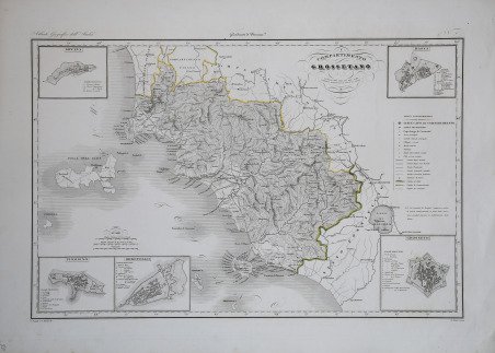Carta geografica tratta dall’Atlante geografico degli Stati italiani delineato sopra le migliori e più moderne mappe per servire di corredo alla corografia fisica storica e statistica dell'Italia, di Attilio Zuccagni Orlandini stampato a Firenze, presso gli editori, 1844. In 2° massimo, 2 voll. Il primo volume contenente le carte dell’Italia Superiore in 52 fogli, il secondo volume quelle dell’Italia Inferiore in 77 fogli. Attilio Zuccagni Orlandini (1784-1872) nacque a Fiesole con il nome di Giuseppe Orlandini. In seguito all’adozione da parte del facoltoso zio materno Attilio Zuccagni (1754-1807), botanico e georgofilo, assunse il nome di Attilio Zuccagni Orlandini. La sua più importante opera è la relazione geografico-cartografica di tutti gli Stati preunitari italiani, la grandiosa Corografia fisica, storica e statistica dell’Italia e delle sue Isole (Firenze 1835-1845), in dodici volumi per diciannove tomi, con un volume introduttivo sull’intera penisola italiana. L’opera costituì la summa delle centinaia di opere geografiche generali, regionali e locali allora disponibili e presentava, per ogni Stato preunitario, la trattazione fisica, storica, topografica e un inquadramento statistico. Nel 1844-45, la Corografia fu arricchita con cinque volumi di cartografie, vedute e altre illustrazioni di luoghi e monumenti: Atlante geografico degli Stati italiani delineato sopra le migliori e più moderne mappe (due volumi con 144 tavole inclusa la grande carta della penisola in 15 fogli) e Atlante illustrativo ossia raccolta dei principali monumenti italiani antichi, del medio evo e moderni e di alcune vedute pittoriche (tre volumi con 413 illustrazioni, stampate su 269 fogli). Le tavole furono incise, sempre a Firenze, in due apposite officine, da quattro valenti artisti lombardi (Vittorio Angeli, Giacinto Maina, Pietro Manzoni e Giuseppe Pozzi). ' Soprattutto il primo dei due atlanti rappresenta, ancora oggi, una pietra miliare nella storia della cartografia e dell’iconografia geografica italiana. Fu veramente ‘un’ardua impresa’, dal momento che spesso mancavano ancora (come, ad esempio, per il Ducato di Lucca e lo Stato Pontificio) prodotti cartografici compiutamente geometrici. I due prodotti furono presentati ai Georgofili nel 1843 e nel 1844, insieme alla mappa della Repubblica di San Marino. L’opera si rivelò oltremodo costosa e non ottenne il successo commerciale sperato, ma servì da base per tante altre iniziative editoriali successive che vi attinsero, talora senza neppure rispettarne i diritti d’autore. Incisione in rame, coloritura coeva dei contorni, lievi ossidazioni, per il resto in ottimo stato di conservazione. ' Bibliografia Cfr. Anna Guarducci - Dizionario Biografico degli Italiani - Volume 100 (2020). Map taken from the Atlante geografico degli Stati italiani delineato sopra le migliori e più moderne mappe per servire di corredo alla corografia fisica storica e statistica dell'Italia, di Attilio Zuccagni Orlandini printed in Florence, 1844. The first volume contains the maps of Northern Italy in 52 sheets, the second volume those of Southern Italy in 77 sheets. Attilio Zuccagni Orlandini (1784-1872) was born in Fiesole under the name of Giuseppe Orlandini. Following adoption by his wealthy maternal uncle Attilio Zuccagni (1754-1807), a botanist and georgofile, he took the name Attilio Zuccagni Orlandini. His most important work is the geographic-cartographic report of all the pre-unification Italian states, the great Corografia fisica, storica e statistica dell'Italia e delle sue Isole (Florence 1835-1845), in twelve volumes for nineteen tomes, with an introductory volume on the entire Italian peninsula. The work constituted the sum of hundreds of general, regional and local geographic works then available and presented, for each pre-unification state, the physical, historical, topographical and statistical framework. In 1844-45, the Corografia was enriched with five volumes of maps, views and other illustrations of places and monuments: Atlante geografico degli Stati italiani delineato sopra le migliori e più moderne mappe (two volumes with 144 plates including the large map of the peninsula in 15 sheets) and Atlante illustrativo ossia raccolta dei principali monumenti italiani antichi, del medio evo e moderni e di alcune vedute pittoriche (three volumes with 413 illustrations, printed on 269 sheets). The plates were engraved, again in Florence, in two special workshops, by four talented Lombard artists (Vittorio Angeli, Giacinto Maina, Pietro Manzoni and Giuseppe Pozzi). ' Especially the first of the two atlases represents, even today, a milestone in the history of cartography and Italian geographic iconography. It was truly 'an arduous undertaking', since cartographic products were often still lacking (as, for example, for the Duchy of Lucca and the Papal States) fully geometric. The two products were presented to the Georgofili in 1843 and 1844, along with the map of the Republic of San Marino. The work proved to be very expensive and did not achieve the commercial success hoped for, but served as a basis for many other subsequent publishing initiatives that drew on it, sometimes without even respecting the copyright. ' Copperplate with fine outline colour, good condition. ' Literature Anna Guarducci - Dizionario Biografico degli Italiani - Volume 100 (2020). Cfr.