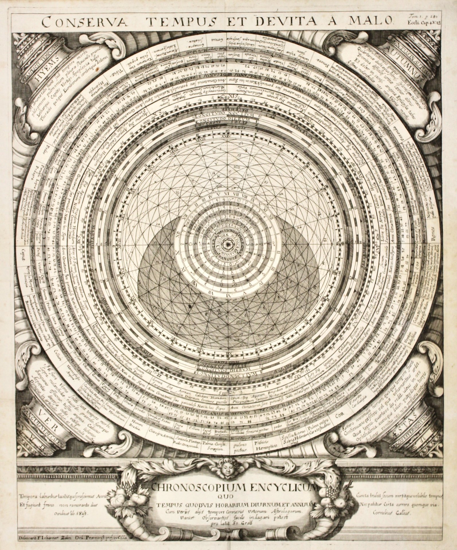 Conserva Tempus et devita a Malo Chronoscopium encyclicum quod tempus quodvis horarium diurnum et annuum cum varijs alys tempori connexis veterum astrologorum vaniis observantis facile indagari potest pro latid 50 grad.