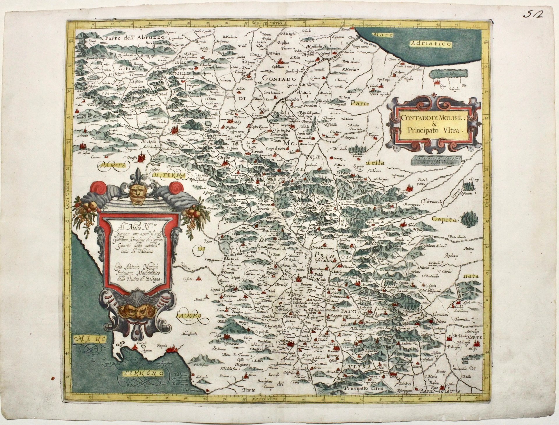 <BR>Incisione in rame, mm 378x420, dipinta a mano. Tratta da “L’Italia” il fondamentale primo atlante con 61 carte di tutta la penisola, che il geografo e matematico Magini realizzò a fine ‘500, ma che, a causa della sua morte nel 1617, fu pubblicato postumo dal figlio Fabio nel 1620. Magini si servì per le incisioni di due famosi intagliatori dell’epoca: il belga Arnoldo Arnoldi e l’inglese Benjamin Wright. Grazie ai contatti personali con le istituzioni ed i più importanti cartografi del tempo, Magini ebbe a disposizione materiale cartografico talvolta inedito o comunque non disponibile per gli studiosi. La sua opera costituì il fondamento di tutta la cartografia del XVII secolo, venendo costantemente copiata da tutti i successivi autori. Buon esemplare, presenta piccoli restauri e due forellini alla piega centrale.