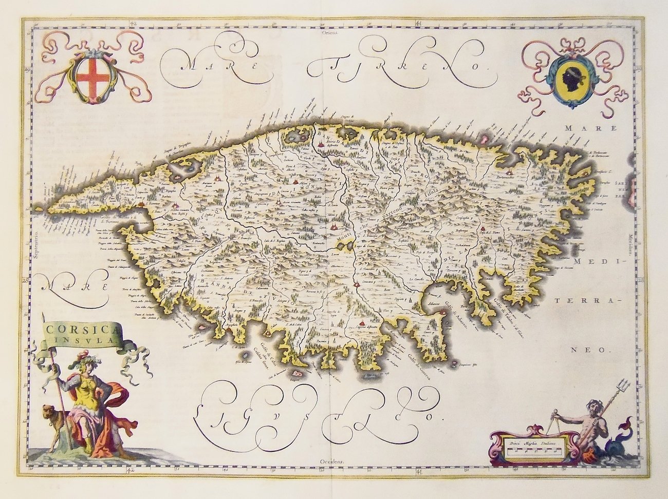 Copper engraving, original colour, mm 386x520. Very good condition, just a very light paper discoloration. W. Blaeu, born in Alkmaar in 1571, studied astronomy by Tycho Brahe and founded a business in 1599 as a globe and instrument maker. He immediately expanded the business publishing maps and in 1630 the first atlas "Atlantis appendix" and five years later the "Atlas novus". After his death in 1638, his son Joan reached publication of the major work of the family, the "Atlas maior" in 11 volumes. in 1672 a great fire destroyed the Blaeu's printing house<BR><BR>
