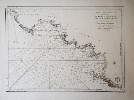 - le carte edite dal Depot de la Marine -Per contrastare lo strapotere navale della flotta inglese re Luigi XIV comprese la necessita di dotare le sue navi di carte nautiche in grado di renderle competitive con la marina antagonista. Un primo tentativo si ebbe con il Neptune Francais del 1693, ma solo agli inizi del diciottesimo secolo iniziò una grande campagna di rilievo delle coste del Mediterraneo e di altri mari, che portò alla realizzazione di numerose mappe, raccolte nel Dépot des Cartes et Planes de la Marine del 1720. Tuttavia il fondatore dell’idrografia francese può essere considerato a tutti gli effetti Jacques Nicolas Bellin (1703-1772) che per oltre cinquant’anni fu al servizio della Marina quale ingegnere e cartografo, tanto che gli venne assegnato il titolo quale primo “Ingegnere Idrografo della Marina” e quindi addirittura quello di “Idrografo Reale”. Durante il suo servizio gli furono commissionati i rilievi delle coste francesi prima e successivamente quelle di praticamente tutto il mondo conosciuto. La sua produzione fu immensa e le sue carte nautiche, di grande qualità, apparvero in più edizioni fino oltre la fine del diciottesimo secolo. Questo grande fondo cartografico diede vita alla produzione ed alla vendita di carte navali, prima basate su quelle del Bellin, successivamente ampliate e migliorate da altri ingegneri di marina, sia francesi che non. Le carte nautiche venivano vendute separatamente e recavano tutte l’inconfondibile timbro con l’ancora e le corone (quando regnava la monarchia) del Depot Generale de la Marine. Raccolte delle stesse carte venivano invece pubblicate sotto il nome di Neptune Francois, monumentale opera che ebbe numerosissime ristampe fino alla metà del secolo successivo. Il seguente gruppo di carte è tratto da un volume denominato Neptune de la Méditerranée, riguardante il Mediterraneo. Dove possibile sono indicati il nome del cartografo, spesso un capitano di vascello, e la data della carta. Incisioni in rame, in eccellente stato di conservazione, salvo controindicazioni. Carta nautica della costa della Provenza compresa tra Marsiglia e Tolone. Restauro all’angolo superiore destro. To fight against the powerful English fleet, king Louis XIV decided to endow his ships with nautical charts that could enable them to compete with the enemy. The Neptune Francais, in 1693, can be considered a first attempt, but it was only at the beginning of the Eighteenth century that a campaign of study of the Mediterranean coasts and sea was started, leading to the realization of maps, collected in the Dépot des Cartes et Planes de la Marine in 1720. Nevertheless, the real founder of French hydrography can be considered Jacques Nicolas Bellin (1703-1772), who served for more than fifty years the navy as engineer and cartographer, which win him first the title of "Hydrographer Engineer of the Navy" and then of "Royal Hydrographer". His first commitment was to study the French coasts fisrt, and then of the whole world. His production was massive and his nautical charts, due also to their quality, were published in many edition until the end of the XVIII century. This allowance led to the production and the selling of sea charts, at first based on those from Bellin, then developed by other navy engineers. The sea charts were sold separately, all bearing the stamp with the anchor and the crowns of the Depot Generale de la Marine. Collections of the same charts have been published under the name of Neptune Francois, a monumental work which has been reissued many times until the half of the following century. The following group of charts is taken from a volume entitled Neptune de la Méditerranée, about the Mediterranean sea. Where possible, there is the name of the cartographer, very often the captain of the ship, and the date of the chart. Engravings, in excellent condition. Cfr.