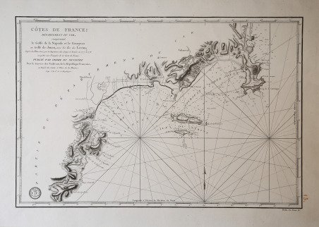 - le carte edite dal Depot de la Marine -Per contrastare lo strapotere navale della flotta inglese re Luigi XIV comprese la necessita di dotare le sue navi di carte nautiche in grado di renderle competitive con la marina antagonista. Un primo tentativo si ebbe con il Neptune Francais del 1693, ma solo agli inizi del diciottesimo secolo iniziò una grande campagna di rilievo delle coste del Mediterraneo e di altri mari, che portò alla realizzazione di numerose mappe, raccolte nel Dépot des Cartes et Planes de la Marine del 1720. Tuttavia il fondatore dell’idrografia francese può essere considerato a tutti gli effetti Jacques Nicolas Bellin (1703-1772) che per oltre cinquant’anni fu al servizio della Marina quale ingegnere e cartografo, tanto che gli venne assegnato il titolo quale primo “Ingegnere Idrografo della Marina” e quindi addirittura quello di “Idrografo Reale”. Durante il suo servizio gli furono commissionati i rilievi delle coste francesi prima e successivamente quelle di praticamente tutto il mondo conosciuto. La sua produzione fu immensa e le sue carte nautiche, di grande qualità, apparvero in più edizioni fino oltre la fine del diciottesimo secolo. Questo grande fondo cartografico diede vita alla produzione ed alla vendita di carte navali, prima basate su quelle del Bellin, successivamente ampliate e migliorate da altri ingegneri di marina, sia francesi che non. Le carte nautiche venivano vendute separatamente e recavano tutte l’inconfondibile timbro con l’ancora e le corone (quando regnava la monarchia) del Depot Generale de la Marine. Raccolte delle stesse carte venivano invece pubblicate sotto il nome di Neptune Francois, monumentale opera che ebbe numerosissime ristampe fino alla metà del secolo successivo. Il seguente gruppo di carte è tratto da un volume denominato Neptune de la Méditerranée, riguardante il Mediterraneo. Dove possibile sono indicati il nome del cartografo, spesso un capitano di vascello, e la data della carta. Incisioni in rame, in eccellente stato di conservazione, salvo controindicazioni. Carta nautica della costa compresa tra Antibes e Cap Roux, con Cannes e l’arcipelago delle isole Lerins. To fight against the powerful English fleet, king Louis XIV decided to endow his ships with nautical charts that could enable them to compete with the enemy. The Neptune Francais, in 1693, can be considered a first attempt, but it was only at the beginning of the Eighteenth century that a campaign of study of the Mediterranean coasts and sea was started, leading to the realization of maps, collected in the Dépot des Cartes et Planes de la Marine in 1720. Nevertheless, the real founder of French hydrography can be considered Jacques Nicolas Bellin (1703-1772), who served for more than fifty years the navy as engineer and cartographer, which win him first the title of "Hydrographer Engineer of the Navy" and then of "Royal Hydrographer". His first commitment was to study the French coasts fisrt, and then of the whole world. His production was massive and his nautical charts, due also to their quality, were published in many edition until the end of the XVIII century. This allowance led to the production and the selling of sea charts, at first based on those from Bellin, then developed by other navy engineers. The sea charts were sold separately, all bearing the stamp with the anchor and the crowns of the Depot Generale de la Marine. Collections of the same charts have been published under the name of Neptune Francois, a monumental work which has been reissued many times until the half of the following century. The following group of charts is taken from a volume entitled Neptune de la Méditerranée, about the Mediterranean sea. Where possible, there is the name of the cartographer, very often the captain of the ship, and the date of the chart. Engravings, in excellent condition. Cfr.