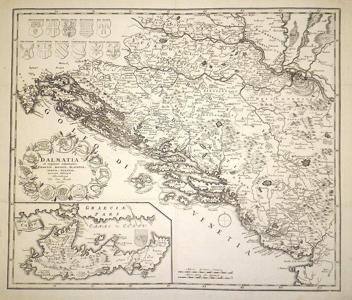 Incisione in rame, mm 480x550. Non comune carta geografica della Dalmatia con in basso a sinistra una carta di Corfù entro riquadro con titolo autonomo "Insulae Corcyrae nunc Corfu dictae nova delineatio". Titolo circondato da medaglioni raffiguranti piante di città e fortezze dalmate. In alto a sinistra 11 stemmi delle regioni al tratto. Bell'esemplare che presenta alcune pieghe orizzontali oltre alla canonica centrale verticale.
