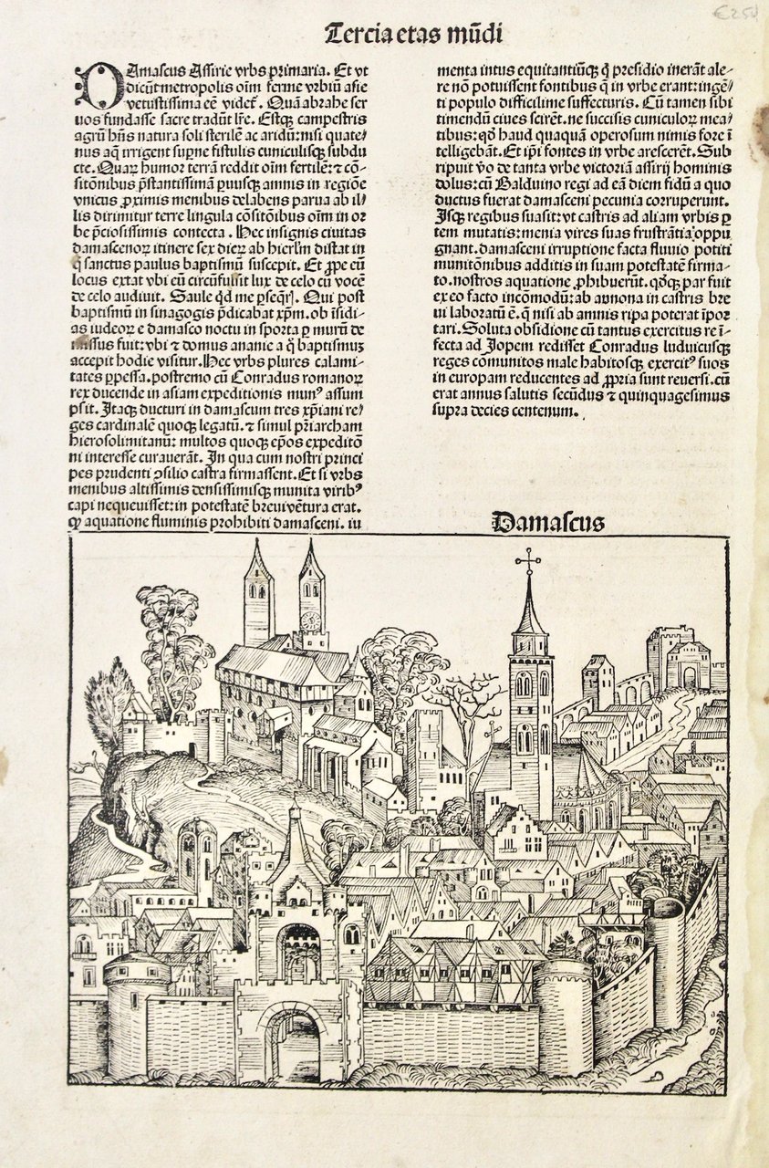 Woodcut, mm 190x225 (sheet 440x280), latin text. Very good condition with a water stain along the right margin<BR>From "Liber Chronicarum", a milestone of illustrated travel-books and one of the most famous books of the 15th century. The engravings are all by Michael Wohlgemuth, teacher of Albrecht Duerer. his stepson Wilhelm Pleydenwurff and some are attributed to Duerer when he was young. <BR><BR>