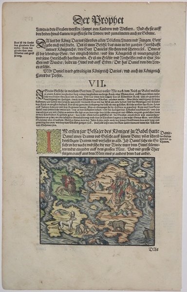 Mappa intagliata in legno, contenuta in una pagina di testo di una Bibbia stampata a Wittenberg. Si tratta di una rara edizione di questa mappa un po' curiosa dell'Europa, dell'Africa e dell'Asia si trova nella letteratura apocalittica proveniente da Wittenberg nel 1530 o addirittura nel 1529. La mappa fu utilizzata per la prima volta dallo stampatore Hans Luft per illustrare due opere: una un commento sul profeta Daniele di Martin Lutero (1530) e un'altra che collega la visione di Daniele con gli assalti dei turchi ai confini dell'Europa cristiana dell'epoca. La mappa raffigura le quattro bestie del sogno di Daniele. La “mappa del mondo di Wittenberg”, più comunemente nota con il termine inglese di Daniel's Dream Map, è probabilmente la mappa del mondo più mistica di tutti i tempi. All'epoca della sua prima pubblicazione come il sessantunesimo mappamondo che andò in stampa, era, da un lato, una rappresentazione del Vecchio Mondo, basata sulla visione tolemaica del mondo, ma comprendente una serie di recenti scoperte spagnole e portoghesi, ma dall'altro, una visualizzazione del sogno apocalittico del profeta Daniele dei quattro regni. Ci sono quattordici diverse versioni della mappa del sogno di Daniele, tutte realizzate con la tecnica della xilografia. Secondo Ernst Gallner questa è la prima versione della mappa: “La prima menzione della mappa del sogno di Daniele viene fatta in un commento al profeta Daniele da parte di Justus Jonas e Philipp Melantone nel dicembre 1529 e subito dopo nel gennaio 1530 in una interpretazione del libro del profeta Daniele di Martin Lutero, entrambi pubblicati da Hans Lufft a Wittenberg. Da questo momento in poi, la mappa appare in una serie di Bibbie luterane, tedesche o di influenza tedesca e in libri teologici del XVI secolo fino alla metà del XVIII secolo, e in un libro sulla storia degli ebrei di Flavio Giuseppe. Queste varianti successive riproducono in parte l'originale, per cui alcuni degli artisti, contrariamente al desiderio di precisione geografica dell'epoca, alterano sempre più i contorni dei continenti, con aspetti visionari che hanno la precedenza sulla corretta rappresentazione cartografica. L'unica variante che si presenta in una Bibbia latina è una mappa schematica e astratta di Tobias Stimmer. Silografia, finemente colorata a mano, in ottimo stato di conservazione. Rara. Woodcut map with fine colouring, set in a text page of a Bible printed in Wittenberg. ' A rare edition of this somewhat curious map of Europe, Africa, and Asia is to be found in apocalyptic literature originally emanating from Wittenberg in 1530 or even 1529. The map was first used by the printer Hans Luft to illustrate two works: one a commentary on the prophet Daniel by Martin Luther (1530) and another linking the vision of Daniel with the assaults of the Turks on the perimeters of Christian Europe at the time. The wood cut map is showing the four beasts of Daniel's Dream Map. The Wittenberg World Map, more commonly known in English as Daniel’s Dream Map, is probably the most mystical world map of all time. At the time of its first publication as the sixty-first world map to go into print, it was, on the one hand, a depiction of the Old World, based on the Ptolemaic world view but including a number of recent Spanish and Portuguese discoveries, but on the other, a visualization of the prophet Daniel’s apocalyptic dream of the four kingdoms. There are fourteen different versions of Daniel’s Dream Map, with twenty printing blocks. All the versions are produced in woodcut technique. According to Ernst Gallner this is the first version of the map “The first mention of Daniel’s Dream Map is made in a commentary on the prophet Daniel by Justus Jonas and Philipp Melanchthon in December 1529 and immediately afterwards in January 1530 in an interpretation of the book of the prophet Daniel by Martin Luther, both published by Hans Lufft in Wittenberg. This version is referred to in the following as the original version. From this time on, the map appears in a number of Lutheran, German or German-influenced bibles and theological books of the 16th up to the mid.18th century, and in a book on the history of the Jews by Flavius Josephus. These later variants partially copy the original, whereby some of the artists, contrary to the wish of the time for geographical accuracy, increasingly alter the outlines of the continents, with visionary aspects taking precedence over correct cartographic depiction. The only variant to occur in a Latin bible is a schematic, abstract map by Tobias Stimmer” (cfr. The Wittenberg World Map). Cfr. R. W. Shirley, "The Mapping of the world", 65A; Kaarten in Bijbels, W.C. Poortman and J. Augusteijn, 1995; Eine Wittenberger Weltkarte aus dem Jahr 1529, W. Bonacker und H. Volz, 1956.