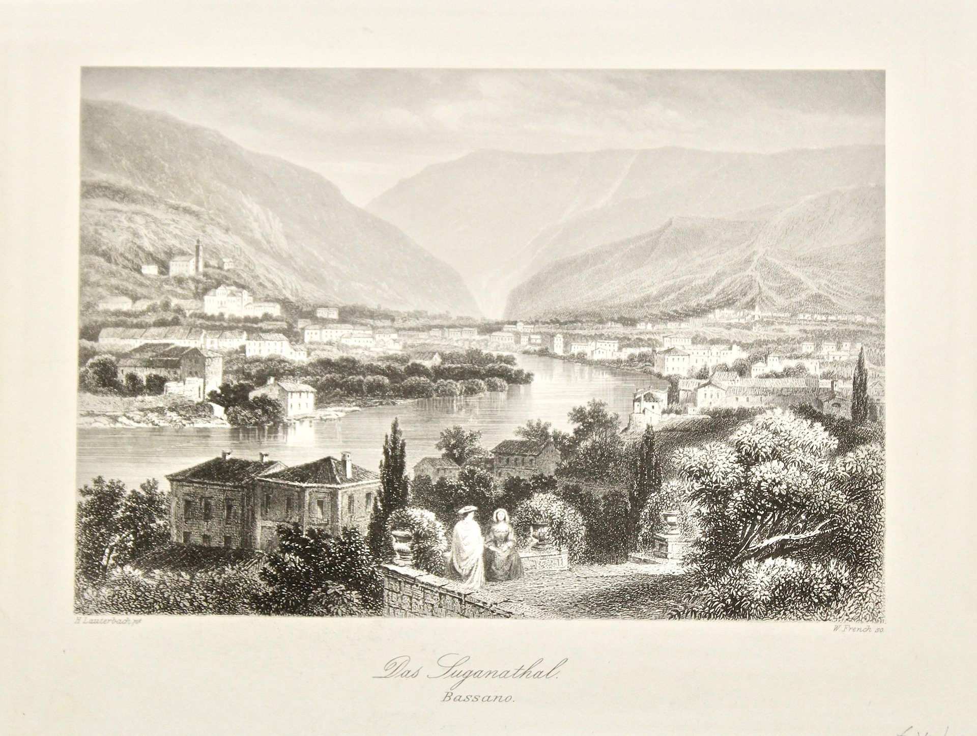 Incisione in acciaio, mm 145x210 (immagine). Bella veduta della vallata con il fiume Brenta. Ottimo esemplare.