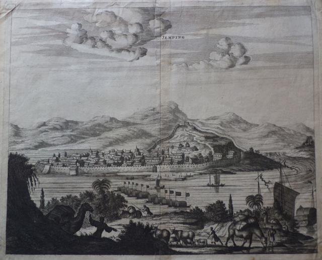 Tratta dal “An Embassy sent by the East-India Company, of the United Provinces, to the Grand Tartar Cham or Emperour of China” (London, John Macock, 1669), incisione in rame all'acquaforte, b/n, cm 29,2 x 36 circa (alla lastra). Il lavoro fu pubblicato come racconto in olandese dal diplomatico Jan Nieuhoff, coordinatore dei primi ambasciatori commerciali olandesi in Cina al servizio della East India Company, compagnia commerciale ansiosa di convincere l'Imperatore ad aprire i porti cinesi all'Olanda. Dopo fu tradotto in inglese dal cartografo britannico ed editore John Ogilby. Questo lavoro rappresenta un documento essenziale di uno dei primi contatti dell' Occidente con la Cina, includendo una descrizione generale dell'impero e molte osservazioni sui costumi. Le raffinate incisioni mostrano vedute di città in Cina, Tibet e Tartaria, insieme a scene di costume e di storia naturale. Veduta animata e panoramica della città di Kinningfoe. John Ogilby (1600 - 1676) – Jan Nieuhoff (Uelsen, 1640 – Madagascar, 1672). Esemplare con stretti margini, piega editoriale, discreta conservazione.