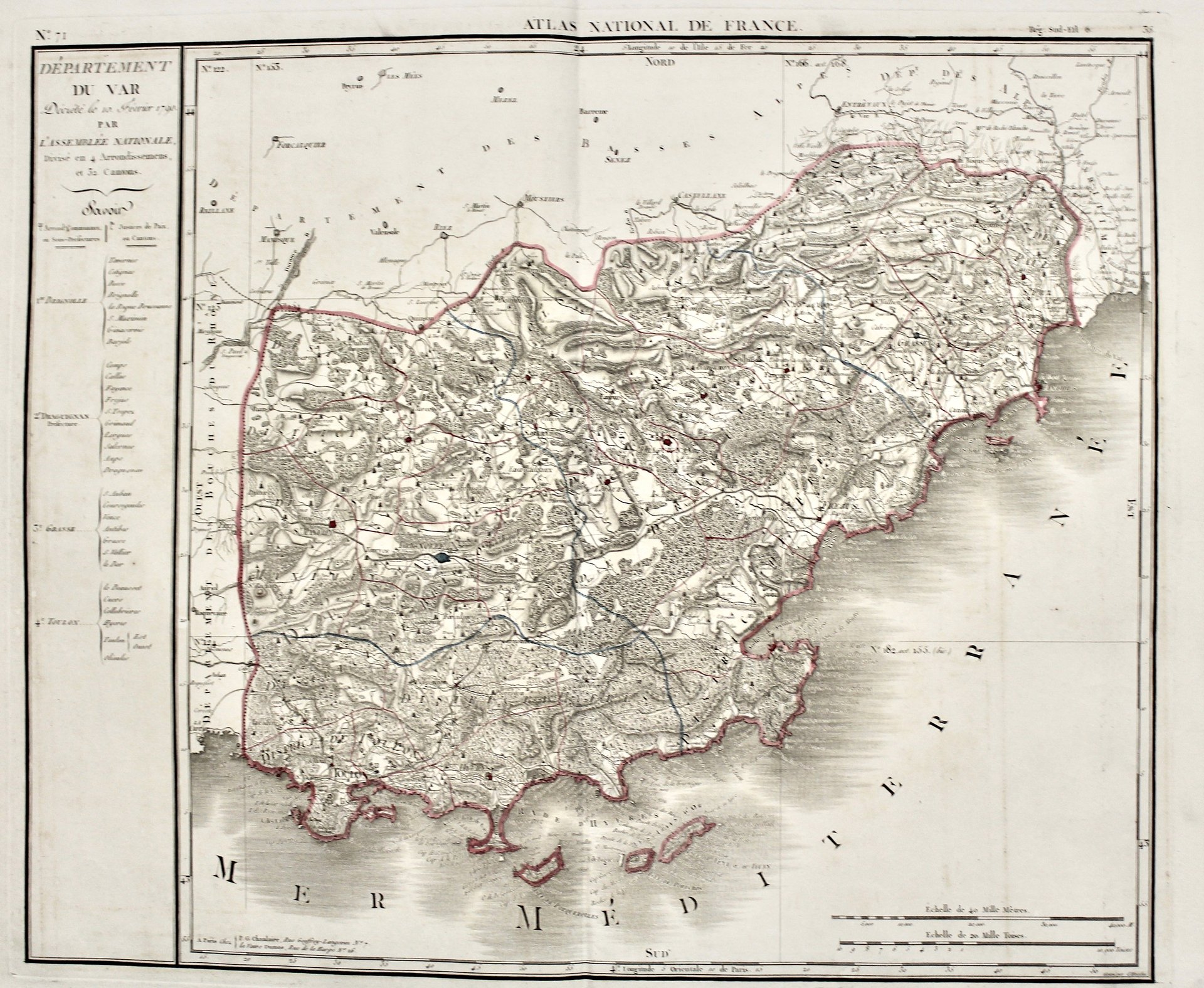 Incisione in rame di Houdon, mm 525x630, dipinta d'epoca ai confini, tratta da "Atlas National de France". Interessante e dettagliata carta colorata a mano lungo i confini. Raffigura tutta la costa da Nizza a La Ciotat. Ottime condizioni, con ampi margini.
