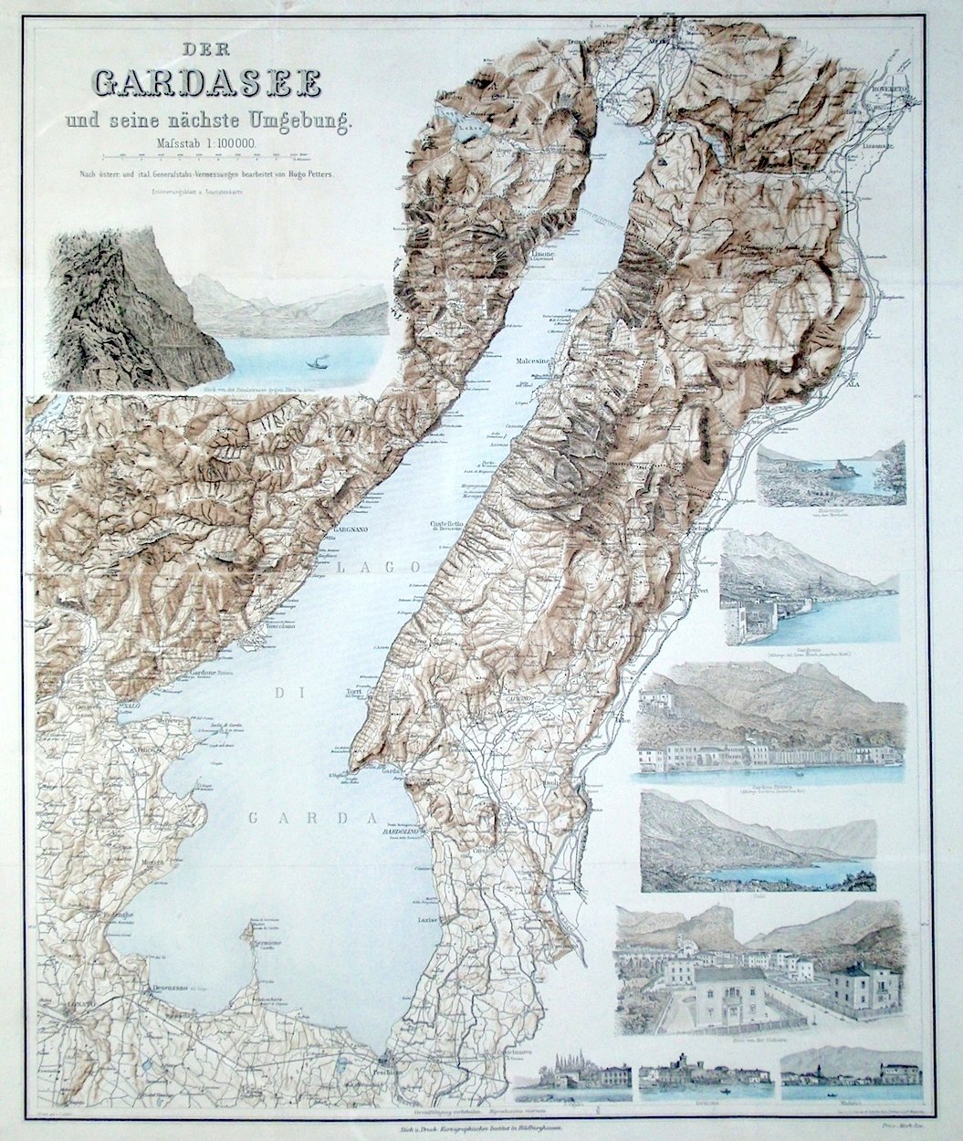 Incisione in rame di mm 570x465, stampata a colori e ritoccata a mano d'epoca che raffigura una carta del Lago di Garda e nove riquadri con vedute di Riva, Malcesine, Gargnano, Gardone-Riviera, Salò, Arco, Maderno, Sirmione e S. Vigilio. Molto rara. Hugo Petters è stato un cartografo e incisore tedesco nato a Weimar nel 1843 e ivi morto nel 1931. Ottimo esemplare con restauro di minime mende nei punti di intersezione delle pieghe editoriali.