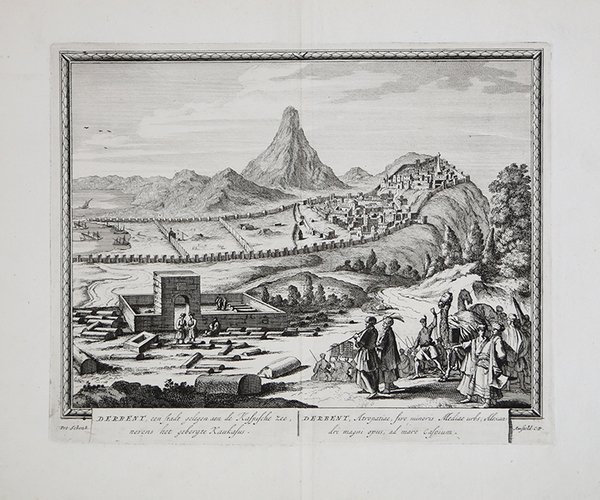 Rara veduta della città di Derbent, sul Mar Caspio; tratta dal famoso atlante di città dello Schenk, denominato "Hecatompolis, sive Totius orbis Terrarum Oppida Nobiliora Centum; exquisite collecta atque eleganter depicta" stampato ad Amsterdam nel 1702.La veduta riconosce come fonte la produzione vedutistica francese coeva (Aveline, Chereau le Jeune, Carel Allard) che a sua volta si rifà al prototipo di Braun e Hegenberg; essa risulta tuttavia personalizzata da un'efficace ed accurata resa grafica, attribuibile alla mano esperta di un incisore dell'officina di Peter Schenk.In basso l'intitolazione è riportata in lingua olandese e latina e si legge il nome dell'editore. L'esemplare ha prodotto numerose filiazioni per tutto il Settecento ed oltre, per cui puó essere a sua volta considerato un prototipo.Peter Schenk (Elberfeld 1645 - 1715), fu un noto incisore e editore olandese, allievo di Gerard Valck ad Amsterdam, ne sposò la figlia e insieme a lui comprò molte lastre della ditta Blaeu nel 1683. Produsse vari atlanti e raccolte di piante e vedute di città, per le quali incise molte nuove carte: ai primi del Settecento fu nominato incisore di corte da Augusto di Sassonia, produsse infatti molti ritratti di personaggi famosi; molte incisioni uscite dalla sua stamperia, che nel frattempo si era notevolmente allargata ed ospitava i migliori incisori del tempo, portano la sua firma soltanto come editore. Alla sua morte l'attività fu continuata dal figlio Peter, detto il Giovane.Incisione in rame, in ottimo stato di conservazione. This is a rare view from Schenk's important town atlas, called "Hecatompolis, sive Totius orbis Terrarum Oppida Nobiliora Centum; exquisite collecta atque eleganter depicta". The veduta recognizes as a source the contemporary French production (Aveline, Chereau le Jeune, Carel Allard) which in turn is based on the prototype of Braun and Hegenberg; however, it is personalized by an effective and accurate graphic rendering, attributable to the expert hand of an engraver of Peter Schenk's workshop.Below the title is in Dutch and Latin and you can read the name of the publisher. The exemplar has produced numerous subsidiaries throughout the eighteenth century and beyond, so it can also be considered a prototype.Peter Schenk (Elberfeld 1645 - 1715), a well-known Dutch engraver and publisher, was a pupil of Gerard Valck in Amsterdam, married his daughter and together with him bought many slabs of the Blaeu company in 1683. He produced various atlases and collections of plants and city views, for which he engraved many new maps: at the beginning of the eighteenth century he was appointed court engraver by Augustus of Saxony, he produced many portraits of famous people, many engravings from his printing house, which in the meantime had expanded considerably and housed the best engravers of the time, bear his signature only as a publisher. At his death the activity was continued by his son Peter, called the Younger.Copperplate, good condition. Cfr.
