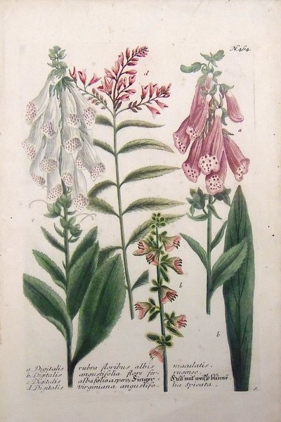 Digitalis rubra floribus albis maculates. Digitalis angustifolia flore ferrugineo. Digitalis alba folio aspero. Digitalis Virginiana angustifolia spicata.