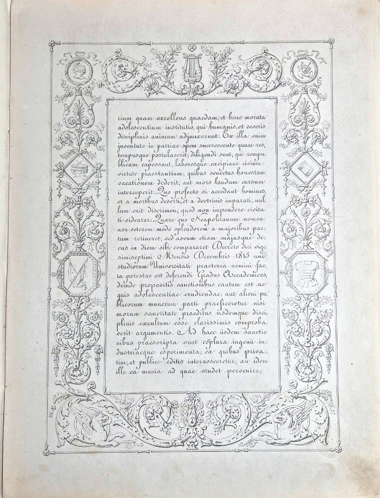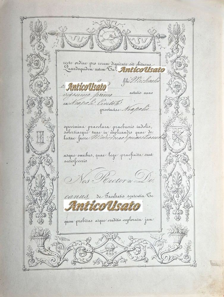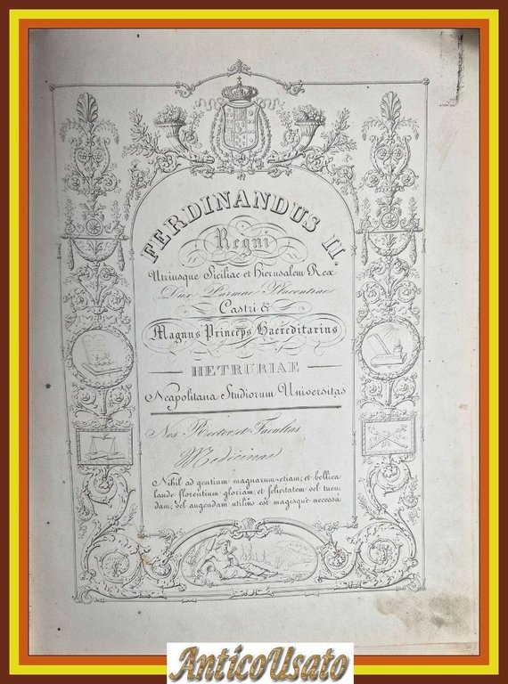 " FERDINANDUS II. REGNI Utriusque Siciliae et Hierusalem Rex Dux Parmae Placentiae Castri & Magnus Princeps Haereditarius HETRURIAE Neapolitana Studiorum Universitas..."DIPLOMA DI LAUREA IN MEDICINA Regia Università degli Studi di Napoli del 1853.