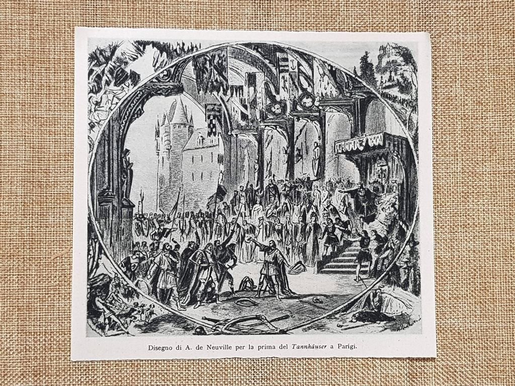 Disegno A. de Neuville Prima del Tannhäuser Opéra di Parigi 1861 Stampa del 1944