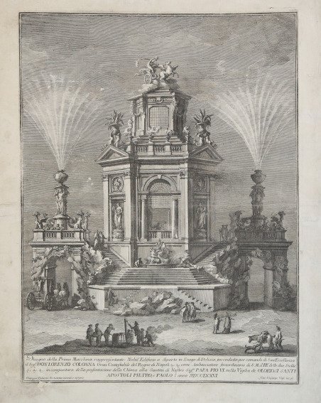 Acquaforte e bulino, 1776. Da un soggetto di Giuseppe Palazzi.Buona prova, impressa su carta vergata coeva, con margini, leggere abrasioni, per il resto in buone condizioni.Le macchine del fuoco per la festa della Chinea. Chinea in senso letterale, era la mula bianca (o il cavallo ambiatore delle Asturie) che i Re di Spagna presentavano annualmente al papa in forma solenne per il pagamento del censo per il Regno di Napoli. Il cavallo, convenientemente ammaestrato, s'inginocchiava davanti al pontefice e gli offriva la somma di danaro contenuta in un vaso d'argento fissato alla sella. L'offerta era preceduta da una solenne cavalcata della durata di due ore e mezza, lungo un itinerario preciso. Per rendere più solenne la cerimonia, con decreto del 12 maggio 1691 di Carlo II, si obbligavano i “grandi” di Spagna a partecipare al solenne corteo, al quale seguivano per due sere spari di macchine pirotecniche accompagnati da esecuzioni musicali, balli e rinfreschi. La chinea, per la sua regolarità, non era soltanto la festa estiva per eccellenza, ma il migliore biglietto da visita della monarchia spagnola (poi di quella napoletana) nella città eterna, l'arma propagandistica più convincente per guadagnare un consenso universale e l'appoggio politico delle altre potenze. Le celebrazioni erano fastosissime, malgrado i problemi politici della nazione, ed il consueto ritardo nell'invio del danaro per il loro svolgimento. In occasione della festa, palazzo di Spagna e, successivamente, palazzo Colonna e palazzo Farnese, diventavano per due mesi all'anno l'atelier di inventori, pittori, disegnatori e architetti di macchine, nonché il momento di aggregazione di artificieri, fuocaroli, musicisti, fornitori e cuochi. Questi palazzi, inoltre, diventavano, per due giorni all'anno, sede dell'ambasciata straordinaria, luogo dal quale partiva la cavalcata e davanti al quale si innalzavano le « stupefacenti » macchine per i fuochi d'artificio, dove si disponevano le luminarie tenute accese le sere della vigilia e il giorno della festività dei santi Pietro e Paolo. Risale agli inizi del Settecento la consuetudine di allestire, il 28 e 29 giugno, due sontuose macchine in piazza santissimi Apostoli (più raramente in piazza Farnese), di cui conosciamo le caratteristiche grazie alle minuziose incisioni, accompagnate da esaurienti didascalie, che vennero stampate annualmente dal 1723. Monopolizzarono la costruzione e progettazione delle macchine di questo periodo Paolo Posi, architetto camerale della Repubblica di Venezia e di casa Colonna, in collaborazione con il suo allievo, l'architetto camerale Giuseppe Palazzi, e con l'incisore Giuseppe Vasi. Posi, ultimo epigono del barocco, celebrava Ferdinando negli apparati come appassionato archeologo, e come l'entusiasta monarca favorevole al trasporto in piazza di elementi popolari sulla platea d'un sontuoso edificio destinato al divertimento pubblico. Più che mai per tali apparati, ove l'incisore lavorò su disegni altrui, come d'altronde per spettacolari cortei o cavalcate cittadine, il Vasi è prezioso testimone ed interprete del suo tempo. Etching, printed on contemporary laid paper, small tear ' and abrasions, otherwise in good conditionThe engravings have been laid on canvas and framed; after a long work to repair them, they now look almost perfect. Signs of glue on verso, on recto signs of abrasions and oxidations.Chinea literally means white female mule, the one the Kings of Spain offered every year to the Pope as a solemn payment of the income of the Kingdome of Naples. The horse, duly trained, knelt in front of the Pope and to offer him a silver vase with money inside, that was fastened to its saddle.The offer was preceded by a solemn ride of two and a half hours, a long and precise itinerary. To make it even more solemn, as per Charles II decree of the 12 of May 1691, the Greats of Spain were obliged to take part to the cortege, which was then followed by two series of pyrotechnical shots and music, dances and food. The chinea, due to its reiteration, was not only the most important summer party, but was even the best way for the Spanish monarchy to present itself in Rome, the best promotional campaign to gain universal consent and political support from the other monarchies.The celebration was massive, notwithstanding the political problems and the late remittance to pay it. When the celebration was organized, and even after that, Palazzo Colonna and Palazzo Farnese became for two months the workshops for inventors, painters, drawers, architects and even pyrotechnists, musicians, suppliers and cooks. These Palazzi became also, for two days, the extraordinary embassy, the starting point of the solemn ride and in front of which the “fabulous” pyrotechnical machines shot their fireworks, where all the light were lightened on the eve and the very day of the celebration of St. Peter and St. Paul. The tradition of building the fireworks machines in the square of Santissimi Apostoli, on the 28 and the 29 of June, was started in the XVIII century (just sometimes in piazza Farnese); all we know about this habit derives from the detailed engravings and the texts that have been printed yearly, starting from 1723.Paolo Posi, architect of the Venetian Republic and of the Colonna Family, and his scholar Giuseppe Palazzi, together with Giuseppe Vasi, literally monopolized the art of building these machines. Posi, the last baroque artist, celebrated King Ferdinando in his creations and the King was absolutely enthusiastic about offering this public spectacular performance.Vasi was, on the other side, an important witness and interpreter of his own time. The set of engravings we present here comes from a Roman collection.The bibliography mentions 45 different works of Vasi dedicates to the pyrotechnical machines. Cfr. Scalabroni 364
