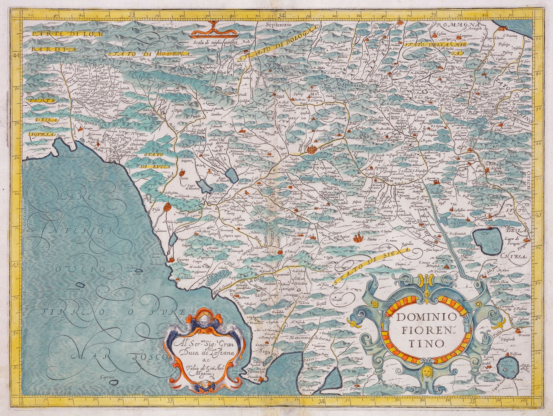 Incisione in rame, mm 350x460, dipinta a mano. Tratta da "Italia", l'importantissimo atlante pubblicato postumo da Fabio Magini, figlio del celebre astronomo e matematico padovano, il primo a delineare e concepire un atlante interamente dedicato all'Italia; per questa opera egli si servì di numerose carte inedite, che riuscì a reperire grazie a conoscenze personali. Il risultato finale assai originale, amalgama di lavori pubblicati a stampa in precedenza e topografie manoscritte, risultò influenzare, per la sua modernità, la cartografia della penisola fino all'inizio del '700. Esemplare in piacevole coloritura, con alcuni strappi restaurati, una integrazione in basso alla piega editoriale centrale piccoli difetti restaurati alla piega centrale. Copper engraving, 350x460 mm, hand-painted. Taken from "Italia", the very important atlas published posthumously by Fabio Magini, son of the famous Paduan astronomer and mathematician, the first to outline and conceive an atlas entirely dedicated to Italy; for this work he made use of numerous unpublished maps, which he managed to find thanks to personal acquaintances. The highly original end result, an amalgamation of previously published printed works and handwritten topographies, was to influence the cartography of the peninsula until the beginning of the 18th century. Exemplar in pleasing colouring, with some restored tears, an addition in the lower central margin and to the frame and small restored flaws to the central fold.