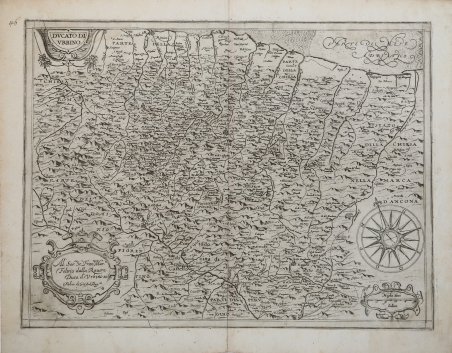 Carta geografica tratta dal ' L’Italia ' a cura di Fabio Magini, edito a Bologna nel 1620, tre anni dopo la prematura morte del padre. Composto da un breve testo descrittivo di sole 24 carte, l’opera è corredata di 61 carte geografiche della penisola, e costituisce il primo esempio di atlante italiano. L’opera è per intero di mano del Magini, che iniziò la realizzazione delle carte nel 1594 circa, dando alla luce per prima nel 1595 la carta del territorio di Bologna. Tutte le carte vennero alle stampe quindi prima del 1620, nelle loro stesure provvisorie, successivamente corrette ed aggiornate per l’edizione definitiva. Per la realizzazione delle lastre il Magini si servì di due dei più famosi intagliatori dell’epoca: il belga Arnoldo Arnoldi e l’inglese Benjamin Wright. La carta del territorio di Urbino è basata sulle precedenti mappe di Giacomo Gastaldi, Luchini, Ferrando Bertelli e Mercator e sulle pitture di Egnazio Danti al Vaticano. Esemplare di secondo stato, con la carta ultimata nella parte cartografica; del primo stato è noto un solo esemplare, alla Biblioteca Vaticana. Orografia, idrografia e toponomastica notevolmente implementate. In basso a destra compare una grande rosa dei venti, con orientazione nord-nord-est in alto. Nel cartiglio in basso a destra scompare la dedica a Federico Bonaventuri, sostituita da quella ' Al’ Ser.mo ' Si.r ' Fran.co ' Mar.a ' Feltrio della Rovere Duca d’Urbino ' & ' c. ' segue la ' Fabio di Gio[vanni] Ant.o ' Mag.ni Bibliografia Almagià (1922): pp. 59-62, n. 16; Almagià (1960): p. 23, tav. XLV; Mangani-Mariano (1998): pp. 154-157, n. 12. Map taken from ' L'Italia ' edited by Fabio Magini, published in Bologna in 1620, three years after the untimely death of his father. Composed of a short descriptive text of only 24 pages, the work is accompanied by 61 maps of the peninsula, and is the first example of an Italian atlas. The work is entirely by the hand of Giovanni Antonio Magini, who began the realization of the maps in 1594 or so; the first dated map (1595) the map of the territory of Bologna. All the maps were printed before 1620, in their provisional drafts, later corrected and updated for the final edition. For the realization of the plates Magini used two of the most famous engravers of the time: the Belgian Arnoldo Arnoldi and the English Benjamin Wright. Copperplate, in good condition. La carta del territorio di Urbino è basata sulle precedenti mappe di Giacomo Gastaldi, Luchini, Ferrando Bertelli e Mercator e sulle pitture di Egnazio Danti al Vaticano. Esemplare di secondo stato, con la carta ultimata nella parte cartografica; del primo stato è noto un solo esemplare, alla Biblioteca Vaticana. Orografia, idrografia e toponomastica notevolmente implementate. In basso a destra compare una grande rosa dei venti, con orientazione nord-nord-est in alto. Nel cartiglio in basso a destra scompare la dedica a Federico Bonaventuri, sostituita da quella ' Al’ Ser.mo ' Si.r ' Fran.co ' Mar.a ' Feltrio della Rovere Duca d’Urbino ' & ' c. ' segue la ' Fabio di Gio[vanni] Ant.o ' Mag.ni Literature Almagià (1922): pp. 59-62, n. 16; Almagià (1960): p. 23, tav. XLV; Mangani-Mariano (1998): pp. 154-157, n. 12. Cfr.