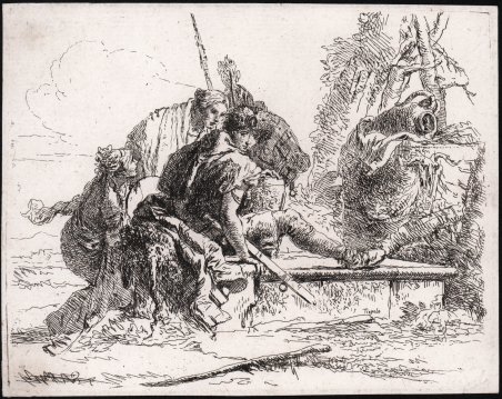 Acquaforte, circa 1740/43, firmata in lastra in basso al centro Tiepolo. Della serie ' Vari Capricci inventati ed incisi dal celebre Gio. Battista Tiepolo. Bellissima prova, impressa su carta vergata coeva priva di filigrana, con piccoli margini, in perfetto stato di conservazione. “Knox (1960, n. 110) riteneva di aver individuato in un disegno del Victoria and Albert Museum "a study for the principal figure" di questo Capriccio. Ma non si tratta di uno studio preparatorio per l'incisione, perché come osservava Pignatti (1965, V), il disegno non è in controparte; esso deve considerarsi come una variazione sul tema scaturita dall'estro di Giambattista. Lo sguardo captante del giovane guerriero e la preoccupata attenzione delle due donne fanno lievitare quell'atmosfera di sottile inquietudine che Tiepolo perseguiva” (cfr. D. Succi, ' La Serenissima nello specchio di rame, ' Splendore di una civiltà figurativa del Settecento, L’opera completa dei Grandi Maestri veneti, p. 456). La storia di questa serie denominata ' Vari Capricci inventati ed incisi dal celebre Gio. Battista Tiepolo ' è piuttosto curiosa: i rami vennero sottratti al Tiepolo da un suo amico, il conte Antonio Maria Zanetti, celebre incisore e collezionista veneziano, che li pubblicò per la prima volta nel 1743, inserendoli nella terza edizione della sua “Raccolta di Chiaroscuri”. Alla morte di Giambattista, vennero pubblicati separatamente per la prima volta nel 1785, probabilmente a cura dell’inglese John Strange, che acquistò i rami l’anno precedente dagli eredi di Zanetti. Giovanni Battista Tiepolo fu uno dei maggiori esponenti della pittura veneziana di tutti i tempi. All'inizio della sua attività pittorica fu influenzato principalmente dal Piazzetta e da Sebastiano Ricci. L'esordio dell'attività incisoria del Tiepolo risale alla fine degli anni Trenta del ’700, e comprende le serie dei Capricci, composta da dieci acqueforti, e degli Scherzi di fantasia, 23 acqueforti incise intorno al 1750. Bibliografia A. D. Vesme, ' Le peintre-graveur italien: ouvrage faisant suite au Peintre-graveur de Bartsch, Milano 1906, p. 408 n. 5; A. Rizzi, ' L'opera grafica dei Tiepolo. Le acqueforti, ' Milano 1971, n. 97; ' D. Succi, ' La Serenissima nello specchio di rame, ' Splendore di una civiltà figurativa del Settecento, L’opera completa dei Grandi Maestri veneti, p. 456, n. 47. Etching, circa 1740/43, signed on plate at lower center Tiepolo. From the so called ' Vari Capricci inventati ed incisi dal celebre Gio. Battista Tiepolo. A good impression, printed on contemporary laid paper, with thin margins, in good condition. “Knox (1960, n. 110) riteneva di aver individuato in un disegno del Victoria and Albert Museum "a study for the principal figure" di questo Capriccio. Ma non si tratta di uno studio preparatorio per l'incisione, perché come osservava Pignatti (1965, V), il disegno non è in controparte; esso deve considerarsi come una variazione sul tema scaturita dall'estro di Giambattista. Lo sguardo captante del giovane guerriero e la preoccupata attenzione delle due donne fanno lievitare quell'atmosfera di sottile inquietudine che Tiepolo perseguiva” (cfr. D. Succi, ' La Serenissima nello specchio di rame, ' Splendore di una civiltà figurativa del Settecento, L’opera completa dei Grandi Maestri veneti, p. 456). Curious is the story of this series called ' Vari Capricci inventati ed incisi dal celebre Gio. Battista Tiepolo. The plates were stolen from a friend of his, Count Antonio Maria Zanetti, a famous engraver and collector in Venice, where they were published for the first time inserting them into the third edition of his Raccolta di Chiaroscuri in 1743. On the death of Giambattista, were published separately for the first time in 1785, probably by the Englishman John Strange, that bought the plates in the previous year by the heirs of Zanetti. Giovanni Battista Tiepolo was one of the greatest exponents of Venetian painting of all time. At the beginning of his painting career was mainly influenced by the Piazzetta and Sebastiano Ricci. The onset of the engraving by Tiepolo dates back to the late thirties of 700, and includes the series of Capricci, consisting of ten etchings, and Scherzi di fantasia, 23 etchings carved around 1750. Literature A. D. Vesme, ' Le peintre-graveur italien: ouvrage faisant suite au Peintre-graveur de Bartsch, Milano 1906, p. 408 n. 5; A. Rizzi, ' L'opera grafica dei Tiepolo. Le acqueforti, ' Milano 1971, n. 97; ' D. Succi, ' La Serenissima nello specchio di rame, ' Splendore di una civiltà figurativa del Settecento, L’opera completa dei Grandi Maestri veneti, p. 456, n. 47. Cfr.