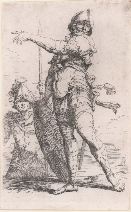 Acquaforte e puntasecca, 1656/8 circa, monogrammata in lastra. Della serie conosciuta come ' Diverse Figure. Bellissima prova, ricche di toni, impressa su carta vergata coeva, con sottili margini, in eccellente stato di conservazione. Esemplare in secondo stato, tutte con il monogramma; le prove di primo stato, ove esistano, sono senza monogramma e note in un solo esemplare. Conosciuta con il nome di ' Diverse Figure ' o ' Figurine, rappresentano senza dubbio l’opera grafica più famosa di Salvator Rosa. Già in epoca era considerata un modello per i giovani artisti, e venne più volte copiata sia in Italia che all’estero. Nelle figure dei soldati in costumi esotici oppure d’invenzione il Rosa svolge un tema trattato da molti incisori quali Callot, Della Bella e Filippo Liagno, con il quale aveva un rapporto stretto, e tramite il quale probabilmente arrivò a conoscere i soggetti dei lanzichenecchi del XV secolo di Dürer e Urs Graf. ' Una lettera dell’artista all’amico Ricciardi datata 1656 permette di datare la serie con sicurezza la periodo 1656/8. Bartsch elenca l’opera composta da 61 stampe, mentre Rotili e Wallace descrivano alcune rare variante dei soggetti, poi mai inserite nella serie, portando il numero delle Figurine a 72. Etching and drypoint, circa 1656/8, monogrammed in plate. From the series known as ' Diverse Figure. Beautiful proof, rich in tone, impressed on contemporary laid paper, with thin margins, in excellent condition. Example of the second state, sjowing the Rosa’s monogram; first-state proofs, where they exist, are unmonogrammed and known in only one copy. Known as ' Diverse Figure ' or ' Figurine, they are without doubt the most famous graphic work of Salvator Rosa. Already at that time it was considered a model for young artists, and was copied several times both in Italy and abroad. In the figures of soldiers in exotic or invented costumes, Rosa develops a theme treated by many engravers such as Callot, Della Bella and Filippo Liagno, with whom he had a close relationship, and through whom he probably came to know the subjects of the fifteenth-century Lansquenets by Dürer and Urs Graf. A letter from the artist to his friend Ricciardi dated 1656 allows the series to be dated with certainty to the period 1656/8. Bartsch lists the work as consisting of 61 prints, while Rotili and Wallace describe some rare variants of the subjects, later never included in the series, bringing the number of Figurine to 72. Cfr. Bartsch 63 III/III; Wallace 62 II/II.
