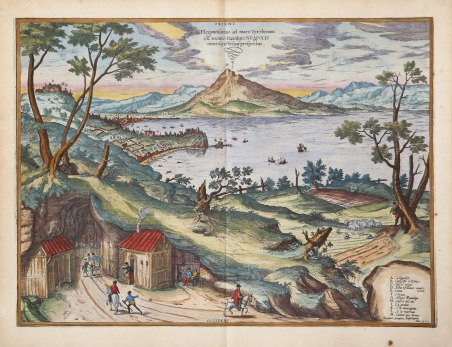 Veduta di Napoli presa dalla collina di Posillipo, derivante dal celebre dipinto di Georg Hoefnagel del 1579. ' L’opera è inserita nel ' Civitates Orbis Terrarum, il primo atlante devoto esclusivamente alle piante e vedute delle principali città del mondo. Stampato in sei volumi tra il 1572 ed il 1617 ebbe grande fortuna e diffusione, tanto che ne furono stampate diverse edizioni tradotte in latino, tedesco e francese. ' Il primo volume delle Civitates Orbis Terrarum fu pubblicato a Colonia nel 1572. Il sesto e ultimo volume apparve nel 1617. Questo grande atlante di città – cartografia urbana - curato da Georg Braun e inciso in gran parte da Franz Hogenberg, conteneva 546 prospettive, vedute a volo d'uccello e vedute cartografiche di città di tutto il mondo. Franz Hogenberg realizzò le tavole dei primi quattro volumi e Simon van den Neuwel (Novellanus, attivo dal 1580) quelle dei volumi V e VI. Georg Braun (1541-1622), un ecclesiastico di Colonia, fu il principale redattore dell'opera e fu molto aiutato nel suo progetto dalla vicinanza e dal continuo interesse di Abraham Ortelius, il cui Theatrum Orbis Terrarum del 1570 fu, come raccolta sistematica e completa di mappe di stile uniforme, il primo vero atlante. Le Civitates, in effetti, erano destinate ad accompagnare il Theatrum, come indicato dalla somiglianza dei titoli e dai riferimenti contemporanei sulla natura complementare delle due opere. Tuttavia, le Civitates erano progettate per avere un approccio più popolare, senza dubbio perché la novità di una raccolta di piante e vedute di città rappresentava un'impresa commerciale più rischiosa di un atlante mondiale, per il quale c'erano stati diversi precedenti di successo. Franz Hogenberg (1535-1590) era figlio di un incisore di Monaco che si era stabilito a Malines. Incise la maggior parte delle tavole del Theatrum di Ortelius e la maggior parte di quelle delle Civitates, e potrebbe essere anche indicato come il responsabile dell'origine del progetto. Oltre un centinaio di artisti e cartografi diversi, il più importante dei quali fu l'artista di Anversa Georg Hoefnagel (1542-1600), fornirono i disegni per le tavole delle Civitates. Hoefnagel non solo contribuì alla maggior parte del materiale originale per le città spagnole e italiane, ma rielaborò e modificò anche quello di altri collaboratori. Dopo la morte di Hoefnagel, il figlio Jakob continuò il lavoro per le Civitates. Gli autori della raccolta si proponevano di raffigurare "non icones et typi urbium", cioè non immagini generiche e tipizzate, "sed urbes ipsae admirabili caelaturae artificio, spectantium oculis subiectae appareant": non intendeva alludere o idealizzare, ma rappresentare fedelmente sulla carta, riprodurre esattamente, e in tempo reale, ciò che l'occhio vede, come annunciato nella prefazione al primo volume delle Civitates Orbis Terrarum. Incisione in rame, bella coloritura coeva con ritocchi, in ottimo stato di conservazione. Bibliografia Van der Kroogt 4, 2995 Fauser, 9620; Taschen Br.Hog., 424. The work is included in the Civitates Orbis Terrarum, the first atlas devoted exclusively to plans and views of the world's major cities. Printed in six volumes between 1572 and 1617 it was so successful and widespread that several editions translated into Latin, German and French were printed. The first volume of the Civitates Orbis Terrarum was published in Cologne in 1572. The sixth and the final volume appeared in 1617. This great city atlas, edited by Georg Braun and largely engraved by Franz Hogenberg, eventually contained 546 prospects, bird-eye views and map views of cities from all over the world. Fransz Hogenberg produced the plates for the first four books, and Simon van den Neuwel (Novellanus, active since 1580) those for volumes V and VI. Georg Braun (1541-1622), a cleric of Cologne, was the principal editor of the work, and was greatly assisted in his project by the close, and continued interest of Abraham Ortelius, whose Theatrum Orbis Terrarum of 1570 was, as a systematic and comprehensive collection of maps of uniform style, the first true atlas. The Civitates, indeed, was intended as a companion for the Theatrum, as indicated by the similarity in the titles and by contemporary references regarding the complementary nature of two works. Nevertheless, the Civitates was designs to be more popular in approach, no doubt because the novelty of a collection of city plans and views represented a more hazardous commercial undertaking than a world atlas, for which there had been a number of successful precedents. Franz Hogenberg (1535-1590) was the son of a Munich engraves who settled in Malines. He engraved most of the plates for Ortelius's Theatrum and the majority of those in the Civitates, and may have been responsible for originating the project. Over a hundred of different artists and cartographers, the most significant of whom was Antwerp artist Georg Hoefnagel (1542-1600), engraved the cooper-plates of the Civitates from drawings. He not only contributed most of the original material for the Spanish and Italian towns but also reworked and modified those of other contributors. After Hoefnagel's death his son Jakob continued the work for the Civitates. The author set out to depict "non icones et typi urbium," that is, not generic and typified images, "sed urbes ipsae admirabili caelaturae artificio, spectantium oculis subiectae appareant": not intended to allude or idealize but to represent faithfully on paper, to reproduce exactly, and in real time, what the eye sees, as announced in the preface to the first volume of ' Civitates Orbis Terrarum. Copperplate engraving, beautiful contemporary coloring, in very good condition. Bibliografia Van der Kroogt 4, 2995 Fauser, 9620; Taschen Br.Hog., 424 Cfr.