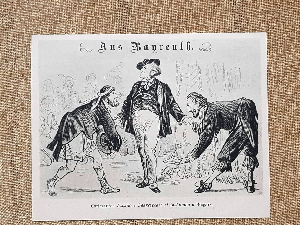 Rara stampa Estratta da pubblicazione del 1944 Questa immagine, pubblicata nel contesto dell’inaugurazione del Festspielhaus di Bayreuth nel 1876, mostra i due massimi drammaturghi della tradizione occidentale — Eschilo, padre della tragedia greca, e Shakespeare, icona del teatro elisabettiano — che rendono omaggio al compositore tedesco, raffigurato come nuovo sommo sacerdote del teatro. La caricatura, apparsa su riviste satiriche come Ulk, riflette l’idea che Wagner abbia superato i suoi predecessori nella fusione tra musica, dramma e mito. È un’immagine provocatoria, ma anche rivelatrice del clima culturale dell’epoca, in cui Bayreuth veniva perceito come un luogo sacro dell’arte totale. Dimensioni: Cm 14,00 x 11,00 Codice prodotto X-026 PayPal Carta di credito Bonifico bancario Inserita dentro plico di adeguate dimensioni per proteggerne l'integrità Spedizione con posta ordinaria o raccomandata scelta dall’Acquirente nel momento del pagamento Clicca qui per accedere al nostro Store ed al suo sterminato archivio