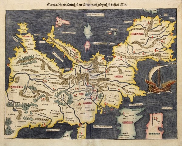 Silografia, dipinta a mano, mm 260x340. Affascinante carta dell'Europa nella visione nordica, cioè ruotata di 180°, con Italia e Spagna in alto. Tratta da "Cosmographey", la più importante opera geografica tedesca dopo la Cronaca di Norimberga del 1493. Sebastian Muenster (1488-1552) è considerato uno degli umanisti ed eruditi tedeschi più importanti. Fu tra i primi europei a intendersi di lingue e culture mediorientali e pubblicò varie opere di tale argomento oltre che di teologia, geografia e cronologia.<BR>Bell'esemplare, con qualche restauro ai margini, qualche alone e traccia di sporco superficiale<BR>
