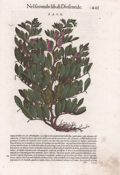 Opera tratta da ' I discorsi di M. Pietro Andrea Matthioli sanese, medico cesareo, et del serenissimo prencipe Ferdinando arcidvca d'Austria & c. Ne i sei Libri di Pedacio Dioscoride Anazarbeo della materia medicinale. ' Con dedica alla Principessa Giovanna, arciduchessa d’Austria (il Mattioli era medico reale), escono in volgare, nel 1568, i sei libri ' di nuovo dallo istesso autore ricorretti, & in più di mille luoghi aumentati. Con le figure grandi tutte di nuovo rifatte, & tirate dalle naturali & vive piante & animali, & in numero maggiore che le altre per avanti stampate. ' Lo stesso Pietro Andrea Mattioli presenta così la nuova edizione del libro, che già ha ricevuto molti consensi e che toccherà il culmine del successo grazie, appunto, alla forma di presentazione molto più organica, alla completezza delle informazioni, e, soprattutto, alla ricchezza e alla chiarezza delle illustrazioni. ' Chi sapesse tutte le virtù delle piante farebbe miracoli: questo enunciato dell’autore sembra animare per primo proprio lui, che va a cercare con certosina pazienza ogni minimo appiglio per lodare le virtù medicinali di ogni erba, raccontando ogni aneddoto, scoprendo ogni notizia curiosa, riportando ogni considerazione fatta sull’argomento da altri studiosi prima di lui. ' Il tono enciclopedico dell’opera si avverte, in maniera evidente, fin dalla dedica. Il discorrere dell’autore, le cui radici toscane o, per meglio dire, senesi non si smentiscono, è agile, piano, adatto ad un pubblico ampio, anche meno colto e poco preparato ma che, in qualche maniera, faceva parte del vasto mondo della medicina e della farmacia del tempo. Non è un caso che il testo sia tra quelli rimasti più a lungo in uso, anche nel piccolo bagaglio librario di famiglie povere o quasi analfabete. ' Alla sostanziosa dedica segue un proemio dedicato agli addetti ai lavori e le solite lettere di complimenti. Seguono due copiose tavole, cioè due indici: uno analitico per tutte le voci, l’altro per patologie. ' L’opera vera e propria inizia con il ritratto a piena pagina di Mattioli e illustra, in sequenza, le piante medicinali (concentrate nei primi quattro libri) e una serie di preparazioni (oli, unguenti, ecc.). Per Mattioli l’occasione è ghiotta sia per potersi dilungare sulla esatta identificazione delle specie, mostrando una vasta preparazione botanica, sia, soprattutto, per mostrare le splendide immagini delle piante, che, a volte, sono anche più di una per esemplare e messe a confronto, qualora il lettore avesse dubbi. Il secondo libro è dedicato in parte agli animali marini (ricci, spugne, seppie, pesci, ecc.) in parte a quelli terrestri (lepri, capriolo, castoreo, rospo, ecc.), comprese le vipere e le api con relativi prodotti (miele, cera, propoli, ecc.). Il quinto libro è dedicato ai minerali e il sesto ai veleni. ' Di ogni voce viene riportato il testo di Dioscoride tradotto in italiano, un esame moderno di identificazione con analogie e confronto dei pareri di autori diversi poi le virtù e i nomi in più lingue. ' Un’opera che ha lasciato il segno nella letteratura medica e farmaceutica del Rinascimento e che, ancora oggi, sprizza fascino ad ogni pagina. Plate taken from ' I discorsi di M. Pietro Andrea Matthioli sanese, medico cesareo, et del serenissimo prencipe Ferdinando arcidvca d'Austria & c. Ne i sei Libri di Pedacio Dioscoride Anazarbeo della materia medicinale ' printed in Venice by Vincenzo Valgrisi.Mattioli's Italian translation of the works of Dioscorides. ' Mattioli (1501-1577) was a Siennese doctor and naturalist. He described more than one hundred new plants and contributed to the development of medical botany. This, his most important work, was first printed in 1544 in Italian, 1554 in Latin, French in 1561, Czech in 1562, and in German in 1563. ' The wood cuts in his work were accurate and standardized enough to allow for easy identification. While nominally a commentary on the work of the botanist Dioscordies, Mattioli significantly expanded the work by adding major new contributions. He relied in part on the contributions of the Turkish diplomat, Buscecq, his doctor, Quakelbeen, and the famed botanist, Luca Ghini, who founded the botanical garden in Pisa. ' In this work, Mattioli significantly provided the first known observation of a tomato being grown and eaten in Italy.Woodcut with fine later hand colour, good condition. Cfr.