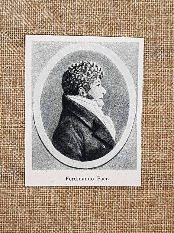 Rara stampa Estratta da pubblicazione del 1944 Ferdinando Paër (1771–1839) fu un compositore italiano di origini austriache, tra i protagonisti del teatro musicale tra Sette e Ottocento, noto per il suo stile elegante, cosmopolita e per l’influenza esercitata su Beethoven, Rossini e Liszt. Nato a Parma, ricevette i primi insegnamenti dal padre Giulio, cornista di corte, e studiò con Gaspare Ghiretti e Francesco Fortunati. Esordì nel 1791 con Orphée et Euridice, e nel 1792 con Circe a Venezia. Dopo numerosi successi, si trasferì a Vienna (1797), dove fu Kapellmeister al Kärntnertortheater e sposò il soprano Francesca Riccardi, protagonista di molte sue opere. Nel 1802 fu nominato maestro di cappella a Dresda, dove compose tre capolavori semiseri: • I fuorusciti di Firenze (1802) • Sargino (1803) • Leonora (1804), sullo stesso soggetto del Fidelio di Beethoven Nel 1806 fu chiamato da Napoleone, che lo nominò compositore di corte e lo portò a Parigi, dove fu direttore del Théâtre-Italien (1812–1827), succedendo a Spontini e precedendo Rossini. Compose oltre 55 opere, tra cui: • Achille (1801) • Agnese (1809), suo capolavoro, ammirato da Chopin, Berlioz e Stendhal • Leonora (1804) • La Didone (1810) • Un caprice de femme (1834) Scrisse anche cantate, oratori, musica sacra e da camera, e fu autore di una Messa piena in re minore. Fu insegnante di Franz Liszt, e nel 1832 divenne direttore della Cappella Reale di Luigi Filippo. Morì a Parigi nel 1839. La sua musica, raffinata e teatrale, rappresenta un ponte tra il classicismo italiano e il romanticismo europeo. Dimensioni: Cm 6,00 x 7,00 Codice prodotto X-026 PayPal Carta di credito Bonifico bancario Inserita dentro plico di adeguate dimensioni per proteggerne l'integrità Spedizione con posta ordinaria o raccomandata scelta dall’Acquirente nel momento del pagamento Clicca qui per accedere al nostro Store ed al suo sterminato archivio