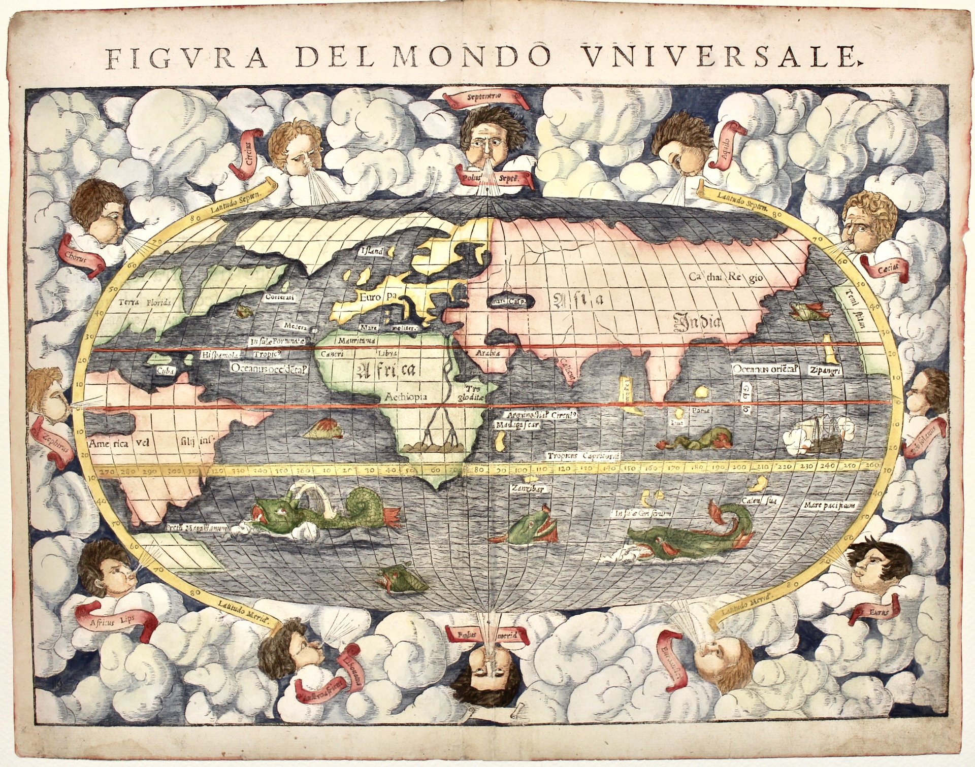 Xilografia, mm 265x380 (foglio mm 310x395), dipinta a mano. Tratta dalla rara edizione italiana della Geographia Universalis, edita nel 1558. Tratta da una edizione italiana della "Cosmographia universalis". Attraente esemplare del secondo planisfero utilizzato da Münster (dal 1550 fino al 1588). Nella parte inferiore non si sviluppa ancora (come nel terzo mappamondo invece) la Terra incognita, un vasto continente che secondo antiche credenze doveva bilanciare le terre emerse dell'emisfero boreale. L'America è ancora nella sua primitiva forma appena abbozzata. La carta in forma ovale è completamente circondata da un'ampia bordura con nuvole e venti animati in forma di putti che soffiano. Negli oceani occhieggiano mostri marini, a sud dello Stretto di Magellano, scoperto meno di due decenni prima della realizzazione di questa carta, si trova una piccola massa terrestre senza toponimo. In questa carta appare una delle prime denominazioni dell'Oceano Pacifico (Mare Pacificum).<BR>Münster fu un brillante polimatico e uno dei più importanti intellettuali dell'epoca rinascimentale. Formatosi a Tubinga, i suoi quaderni universitari sopravvissuti, il Kollegienbuch, rivelano una mente dalla curiosità insaziabile, soprattutto per quanto riguarda la cosmografia. In seguito Münster divenne professore di ebraico a Heidelberg e poi, dal 1529, all'Università di Basilea. Negli anni Trenta del Quattrocento si dedicò alla traduzione della Geografia di Tolomeo, aggiungendo nuovo materiale relativo alle nuove terre scoperte in Africa, nelle Americhe e in Asia. Il risultato fu la pubblicazione della sua apprezzata Geographia Universalis, stampata per la prima volta nel 1540. Fu anche un innovatore per quanto riguarda il design e l'impaginazione delle mappe, e fu uno dei primi a creare uno spazio sui suoi blocchi di legno per l'inserimento dei nomi dei luoghi in caratteri metallici. <BR>Buon esemplare che presenta dei difetti del tempo (piccoli forellini in lastra e al margine sup.) reintegro cartaceo parziale ai margini laterali. Shirley, The mapping of the world, 92. <BR>An attractive example of the rare 1558 italian edition of Sebastian Munster's map of the world. Munster presents us with an expansive view the world with a number of interested cartographic features. Along the bottom of the map the dramatic unknown southern continent (Terra Australis Nondum Congnita) stretches to include the discovered lands of Tierra de Fuego and what appears to be a proto-Australia. South America bears the characteristic western budge in the vicinity of Chile that appeared on many early maps. The cartographer also maps a impressive and seemingly navigable northwest and northeast passages. The map is oval in form and surrounded by elaborate vine and leave engraving. The verso contains italian text describing the earth. Buon esemplare che presenta un reintegro cartaceo parziale ai margini laterali<BR>