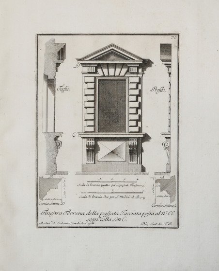 Tavola architettonica tratta dal celebre ' Studio d'architettura civile delle fabbriche più insigni di Firenze ' di Ferdinando Ruggieri, pubblicato a Firenze tra il 1722 e il 1728. Ruggieri, architetto ed incisore, è esponente significativo del primo Settecento fiorentino. ' ' Nel 1717 il suo nome appare nell’elenco dei contributori dell’Accademia del disegno di Firenze, le cui tasse continuò a versare fino al 1740, mentre risulta immatricolato dal 1720. Dietro suggerimento dell’abate Bottari – come quest’ultimo scriveva in una lettera del 1764 a Giovanni Pietro Zanotti –, nel 1718 fu avviata l’impresa editoriale dello ' Studio d’architettura civile, una raccolta di particolari architettonici da palazzi e fabbriche esemplari di Firenze. Fu pubblicato in tre volumi in folio presso la Stamperia Reale rispettivamente nel 1722, nel 1724 e nel 1728; un quarto volume, annunciato nella prefazione al primo, non fu composto. L’operazione editoriale maturò quando era ormai certa l’estinzione della dinastia medicea e nei tre volumi (rispettivamente dedicati al granduca Cosimo III, al granduca Gian Gastone e a Maria Luisa, elettrice palatina, ultima rappresentante della famiglia) si celebra la secolare attività di mecenati a partire da Cosimo il Vecchio con Filippo Brunelleschi e Lorenzo il Magnifico con Michelangelo Buonarroti. L’approccio ‘scientifico’ al lavoro è ricordato dallo stesso Ruggieri, che sottolinea il controllo totale avuto sulle varie fasi essendo egli stato rilevatore, disegnatore, incisore e responsabile delle scelte critiche delle architetture da presentare. (cfr. Oronzo Brunetti - Dizionario Biografico degli Italiani - Volume 89). Incisione in rame, stampata su carta vergata coeva, con margini, in ottimo stato di conservazione. Architectural plate from Ferdinando Ruggieri's famous ' Studio d'architettura civile delle fabbriche più insigni di Firenze, ' published in Florence between 1722 and 1728. Ruggieri was an architect and engraver, a significant exponent of early 18th-century Florence. In 1717 his name appears in the list of contributors to the “Accademia del disegno” in Florence, whose fees he continued to pay until 1740, while he is registered from 1720. At the suggestion of Abbot Bottari ' ' the publishing venture of the ' Studio d'architettura civile, a collection of architectural details from exemplary palaces and factories in Florence, was begun in 1718. It was published in three folio volumes at the Stamperia Reale in 1722, 1724 and 1728 respectively; a fourth volume, announced in the preface to the first, was not composed. The publishing operation matured when the extinction of the Medici dynasty was certain, and the three volumes (respectively dedicated to Grand Duke Cosimo III, Grand Duke Gian Gastone and Maria Luisa, electress palatine, the last representative of the family) celebrate the centuries-long patronage activities starting with Cosimo the Elder with Filippo Brunelleschi and Lorenzo the Magnificent with Michelangelo Buonarroti. The 'scientific' approach to the work is recalled by Ruggieri himself, who emphasizes the total control he had over the various stages having been surveyor, draughtsman, engraver and responsible for the critical choices of the architectures to be presented. Copperplate, printed on contemporary laid paper, with margins, good condition. Cfr.