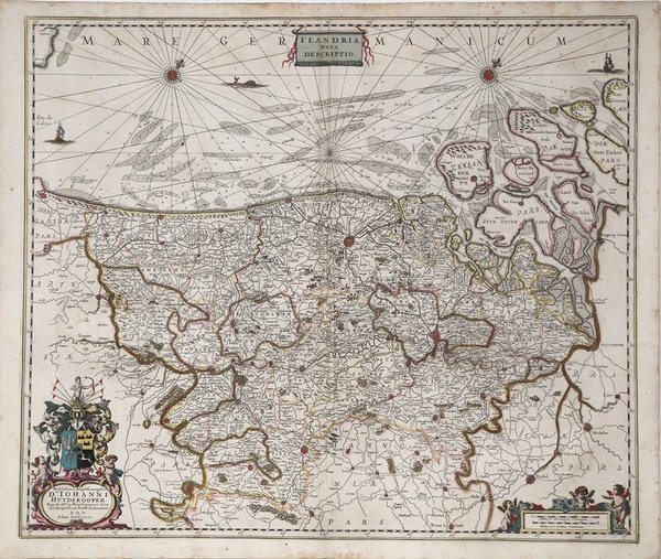 Bella carta delle Fiandre di J. Janssonius.Dall'edizione latina dell'Atlas Novus. Joannes Janssonius, figlio dell'editore di Arnhem Jan Janssen, sposò Elisabeth Hondius, figlia di Jodocus Hondius, ad Amsterdam nel 1612. Dopo il suo matrimonio, si stabilì in questa città come libraio ed editore di materiale cartografico. Nel 1618 si stabilì ad Amsterdam accanto alla libreria di Willem Jansz. Blaeu, entrando in una seria competizione. Le sue attività non riguardavano solo la pubblicazione di atlanti e libri, ma anche di mappe singole e un vasto commercio di libri con filiali a Francoforte, Danzica, Stoccolma, Copenaghen, Berlino, Koningsbergen, Ginevra e Lione. Nel 1631 iniziò a pubblicare atlanti insieme a Henricus Hondius. Nei primi anni 1640 Henricus Hondius lasciò l'attività di pubblicazione di atlanti completamente a Janssonius. La concorrenza con Joan Blaeu, figlio e successore di Willem, nella produzione di atlanti spinse Janssonius ad ampliare il suo Atlas Novus finalmente in un'opera di sei volumi, in cui furono inseriti un atlante marino e un atlante del Vecchio Mondo. Dopo la morte di Joannes Janssonius, il negozio e la casa editrice furono continuati dagli eredi sotto la direzione di Johannes van Waesbergen (c. 1616-1681), genero di Joannes Janssonius. Le matrici degli atlanti di Janssonius furono in seguito vendute a Schenk e Valck. Incisione su rame, coloritura coeva dei confini, in ottimo stato di conservazione. Large map of Flanders by I. Janssonius.With decorative cartouches for the title scale and dedication. This example was published in the 'Atlas Contractus', a two-volume atlas, published two years after Jansson's death by his son-in-law, Jan Jansson van Waesbergen. Joannes Janssonius (Arnhem, 1588-1664), son of the Arnhem publisher Jan Janssen, married Elisabeth Hondius, daughter of Jodocus Hondius, in Amsterdam in 1612. After his marriage, he settled down in this town as a bookseller and publisher of cartographic material. In 1618 he established himself in Amsterdam next door to Blaeu’s book shop. He entered into serious competition with Willem Jansz. Blaeu. His activities not only concerned the publication of atlases and books, but also of single maps and an extensive book trade with branches in Frankfurt, Danzig, Stockholm, Copenhagen, Berlin, Koningsbergen, Geneva, and Lyon. In 1631 he began publishing atlases together with Henricus Hondius. In the early 1640s Henricus Hondius left the atlas publishing business completely to Janssonius. Competition with Joan Blaeu, Willem’s son and successor, in atlas production prompted Janssonius to enlarge his Atlas Novus finally into a work of six volumes, into which a sea atlas and an atlas of the Old World were inserted. After the death of Joannes Janssonius, the shop and publishing firm were continued by the heirs under the direction of Johannes van Waesbergen (c. 1616-1681), son-in-law of Joannes Janssonius. The copperplates from Janssonius’s atlases were afterwards sold to Schenk and Valck. Copperplate, outline in contemporary old colors, in very good condition. Cfr. Van der Krogt 1, 3200:1C.