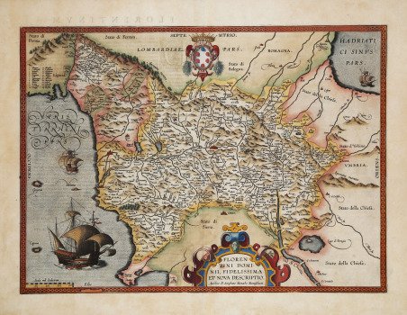 Prima derivazione della rarissima carta di Stefano Buonsignori del 1584, inserita nel Theatrum Orbis Terrarum di Ortelius a partire solo dal 1595. Il ' Theatrum Orbis Terrarum ' è considerato il primo vero “atlante” moderno. L’opera fu pubblicata in 7 lingue e 36 edizioni, per il quale – nel 1570 - Ortelius ottenne il ' privilegio, ovvero una sorta di diritto d'autore che impediva ad altri cartografi di pubblicare i propri lavori. Il ' Theatrum ' rappresentava il lavoro più avanzato del lavoro della descrizione cartografica. L’Ortelius vi raccolse il sapere geografico e cartografico del suo tempo, proponendo in 147 spettacolari tavole incise l’immagine più fedele del mondo allora conosciuto e, in alcune straordinarie “carte storiche”, regioni e itinerari tratti dalla letteratura, dalla mitologia, dalla tradizione. Ortelius fu anche il primo a citare le fonti, menzionando i nomi dei cartografi nel “catalogus auctorum”. Dal 1598 al 1612 le edizioni postume del ' Theatrum ' furono realizzate dal suo collaboratore Johannes Baptiste Vrients. Magnifica prova, in perfetto stato di conservazione. Scarce map of the Province of Florence in Tuscany, first issued in in the Vrients edition of Ortelius' Theatrum Orbis Terrarum in 1595.The map is centered on the city of Florence and extends to Liguria, the Apennine Mountains, the Adriatic Coast, Siena and Lago di Perugia. The map is based upon Stefano Buonsignori's map of Florence and surroundings, engraved in 1584 by Domenico Vito. The map was sent to Ortelius by Marcarius in late 1594 or early 1595, as there exists a letter from Marcarius to Ortelius dated March 1595 which inquires whether Ortelius had received the map. The map identifies Stephanus Monachus of Orivieti as the maker. The ' Theatrum Orbis Terrarum ' is considered the first true modern "Atlas". The work was published in 7 languages and 36 editions, for which - in 1570 - Ortelius obtained the privilege, a kind of copyright that prevented other cartographers from publishing his works. The ' Theatrum ' represented the most advanced work of cartographic description. Ortelius collected in it the geographical and cartographic knowledge of his time, proposing in 147 spectacular engraved plates the most faithful image of the world then known and, in some extraordinary "historical maps", regions and routes taken from literature, mythology, tradition. Ortelius was also the first to cite sources, mentioning the names of cartographers in the "catalogus auctorum". From 1598 to 1612 the posthumous editions of the ' Theatrum ' were made by his collaborator Johannes Baptiste Vrients. Copper engraving, contemporary coloring, in good condition. Cfr. Van den Broecke 131.
