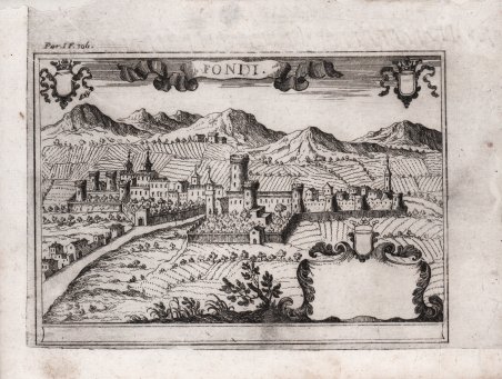 Veduta della città tratta da ' Il Regno di Napoli in prospettiva diviso in dodeci provincie, in cui si descrivono la sua metropoli fidelissima città di Napoli… Opera postuma divisa in tre parti dell'abate Gio. Battista Pacichelli parte prima [terza] . - In Napoli: nella stamperia di Michele Luigi Mutio, 1700 - 1703. Questa monumentale opera dell'abate Pacichelli si propone di raccontare la storia politico-militare, religiosa, urbanistica, economica ed artistica di 148 città e degli annessi territori, nelle 12 provincie costituenti quello che fu un tempo il Regno di Napoli. Di ogni singolo comune vengono narrate le origini, la situazione economica, le vicende storiche, la topografia e i monumenti, le opere letterarie, i culti e le reliquie dei Santi venerati. Valore aggiunto e parte integrante dei volumi di Pacichelli sono le nitide incisioni che ritraggono tutti i centri del regno napoletano realizzate da Michele Luigi Muzio e le carte geografiche opera di Francesco Cassiano De Silva. L'opera fu consegnata agli editori nel 1692, ma andò in stampa solo dopo la morte di Pacichelli (1695). ' Incisione in rame, nel complesso in ottimo stato di conservazione. Rara. View of the city taken from ' Il Regno di Napoli in prospettiva diviso in dodeci provincie, in cui si descrivono la sua metropoli fidelissima città di Napoli. Opera postuma divisa in tre parti dell'abate Gio. Battista Pacichelli parte prima [terza . - In Naples: in the printing house of Michele Luigi Mutio, 1700-1703. This monumental work by Abbot Pacichelli sets out to recount the political-military, religious, urban, economic and artistic history of 148 cities and their annexed territories, in the 12 provinces that made up what was once the Kingdom of Naples. The origins, economic situation, historical events, topography and monuments, literary works, cults and relics of the saints venerated are described for each individual municipality. An added value and an integral part of Pacichelli's volumes are the sharp engravings depicting all the centres of the Neapolitan kingdom by Michele Luigi Muzio and the maps by Francesco Cassiano De Silva. The work was delivered to the publishers in 1692, but only went into print after Pacichelli's death (1695). ' Copperplate, overall in excellent condition. Rare. ' Incisione in rame, nel complesso in ottimo stato di conservazione. Rara. Cfr.