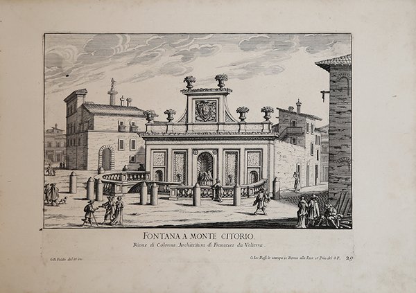 Questa fontana si trovava di fronte al costruendo palazzo Ludovisi a Montecitorio. Con disegno dell'architetto Francesco Capriani da Volterra, fu fatta erigere dal cardinale di Santa Severina, di cui reca in alto lo stemma, durante il pontificato di Sisto V (1585-90). L'opera fu abbattuta, insieme con alcune case intorno, verso la fine del '600, in vista della sistemazione dello spazio urbano antistante il palazzo. Tavola della serie Le Fontane di Roma, edita da Giovanni Giacomo de Rossi alla Pace, senza data ma intorno al 1680. Falda, che muore a Roma nel 1678, incise le tavole del primo e del secondo volume, intitolati rispettivamente dal titolo Le Fontane di Roma nelle Piazze, e luoghi publici della città e Le fontane delle ville di Frascati, nel Tusculano. Le tavole del terzo e quarto volume, Le fontane ne' palazzi e ne' giardini di Roma e Le fontane del giardino Estense in Tivoli, furono, invece, incisi da Giovanni Francesco Venturini. ' Falda, nativo di Valduggia, all'età di 14 anni fu inviato a Roma ed affidato alle cure di uno zio che lo segnalò a Gian Lorenz Bernini. Ma fu l'incontro con lo stampatore Giovanni Giacomo De Rossi a segnare una svolta nella carriera artistica del Falda: infatti il suo talento venne indirizzato dall'editore all'arte dell'incisione. Il suo tirocinio nella tipografia romana venne benevolmente accolto alla corte papale, tanto che Alessandro VII gli affidò l'incarico di disegnare le fabbriche della residenza di Castel Gandolfo. Nel 1665 Falda diede alle stampe per l'editore De Rossi il suo capolavoro: le tavole del primo libro del Nuovo Teatro delle fabbriche, et edificii, in prospettiva di Roma moderna sotto il felice pontificato di n. s. Alessandro VII, al quale seguirono, tra il 1665 e il '69, il secondo ed il terzo. L'opera aveva lo scopo di divulgare la nuova immagine di Roma: il Papa, infatti, decise di aprire nuove strade, di abbellire con fontane e monumenti la città, anche a dimostrazione della potenza finanziaria e culturale della sua famiglia. Con il Nuovo Teatro, come poi con le successive raccolte dedicate alle fontane e ai palazzi, Falda diventò il divulgatore di questi aspetti; le sue vedute incise, caratterizzate dall'attenzione sia alle regole prospettiche sia agli effetti scenografici, sfruttano abilmente il vigore della linea e la ricchezza del contrasto fra bianco e nero, in sintonia con i criteri spaziali dell'arte barocca. ' Acquaforte, impressa su carta vergata coeva, in ottimo stato di conservazione. Bibliografia The Illustrated Bartsch, vol. 47/2, pp.4-28. Olschki, Choix, XI, 16899; Rossetti 4830. Plate from the series Le Fontane di Roma, published by Giovanni Giacomo de Rossi alla Pace, undated but before 1680. Falda, who died in Rome in 1678, engraved the plates of the first and second volume, entitled respectively Le Fontane di Roma nelle Piazze, e luoghi publici della città and Le fontane delle ville di Frascati, nel Tusculano. The plates of the third and fourth volume, Le fontane ne' palazzi e ne' giardini di Roma and Le fontane del giardino Estense in Tivoli, were instead engraved by Giovanni Francesco Venturini. Falda, a native of Valduggia, at the age of 14 was sent to Rome and entrusted to the care of an uncle who pointed him out to Gian Lorenz Bernini. But it was the meeting with the printer Giovanni Giacomo De Rossi that marked a turning point in Falda's artistic career: in fact his talent was directed by the publisher to the art of engraving. His apprenticeship in the Roman printing house was well received at the papal court, so that Alexander VII entrusted him with the task of designing the buildings of the residence of Castel Gandolfo. In 1665 Falda printed for the publisher De Rossi his masterpiece: the tables of the first book of the Nuovo Teatro delle fabbriche, et edificii, in prospettiva di Roma moderna sotto il felice pontificato di n. s. Alessandro VII, which was followed, between 1665 and '69, by the second and third books. The work was intended to spread the new image of Rome: the Pope, in fact, decided to open new streets, to embellish the city with fountains and monuments, also to demonstrate the financial and cultural power of his family. With the Nuovo Teatro, as with the subsequent collections dedicated to fountains and palaces, Falda became the popularizer of these aspects. His etched views, characterized by attention to both the rules of perspective and the scenographic effects, skillfully exploit the vigor of the line and the richness of the contrast between black and white, in tune with the spatial criteria of Baroque art. Etching, printed on contemporary laid paper, in excellent condition. Bibliografia The Illustrated Bartsch, vol. 47/2, pp.4-28. Olschki, Choix, XI, 16899; Rossetti 4830. Cfr.