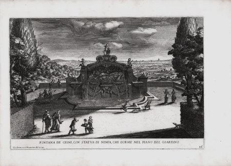 Veduta tratta dalla serie ' Le Fontane di Roma, 1680 circa. Iniziata da Giovan Battista Falda nel 1667 circa, la serie venne ultimata da Giovanni Francesco Venturini, che incise - da propri disegni - le due serie ' Le fontane del giardino estense in Tivoli ' e ' Le fontane ne' palazzi e ne' giardini di Roma con li loro prospetti et ornamenti, pubblicate dall'editore romano G. G. De Rossi (1684 circa) a completamento della celebre opera. Venturini fu incisore, nato a Roma nel 1650, morto dopo il 1710. Il suo nome è specialmente legato alle due serie di stampe, da lui disegnate e incise, ' Le fontane ne' ' palazzi e ne' giardini di Roma ' e ' Le fontane del giardino estense in Tivoli, ' con. ' veduta della cascata del fiume Aniene, pubblicate da Giovanni Giacomo De Rossi, circa il 1684, a completamento della celebre opera di G. B. Falda. Di sua invenzione sono le incisioni per l'opera sulle ' Chiocciole ' di Filippo Buonanni. Collaborò alla raccolta ' Insignium Romae templorum prospectus, e ad altre imprese dell'editoria calcografica del tempo. Incise anche da Polidoro da Caravaggio, dal Nasini, dal Domenichino (Caccia di Diana) e da altri. Acquaforte, con margini, in buono stato di conservazione. Bibliografia TIB ' The Illustrated Bartsch ' - Commentary Volumes. 1978–, cat. n. 47 pt. 2 Commentary pp. 4-29, .005-.055; pp. 41-42, .077-080. View taken from the series ' Le Fontane di Roma, ' 1680 approx. Begun by Giovan Battista Falda in about 1667, the series was completed by Giovanni Francesco Venturini, who engraved - from his own drawings - the two series ' Le fontane del giardino estense in Tivoli ' and ' Le fontane ne' palazzi e ne' giardini di Roma con li loro prospetti et ornamenti, published by the Roman publisher G. G. De Rossi (about 1684) to complete the famous work. Venturini was an engraver, born in Rome in 1650 and died after 1710. His name is especially linked to the two series of prints, drawn and engraved by him, ' Le fontane ne' palazzi e ne' giardini di Roma ' and ' Le ' fontane del giardino estense in Tivoli, con. view of the waterfall of the Aniene River, published by Giovanni Giacomo De Rossi, circa 1684, completing the celebrated work of G. B. Falda. Of his own invention are the engravings for the work on the ' Chiocciole ' by Filippo Buonanni. He collaborated on the collection ' Insignium Romae templorum prospectus, and other enterprises of intaglio publishing of the time. He also engraved by Polidoro da Caravaggio, Nasini, Domenichino (Hunting Diana) and others. Etching, with margins, in good condition. Bibliografia TIB ' The Illustrated Bartsch ' - Commentary Volumes. 1978–, cat. n. 47 pt. 2 Commentary pp. 4-29, .005-.055; pp. 41-42, .077-080. Cfr.