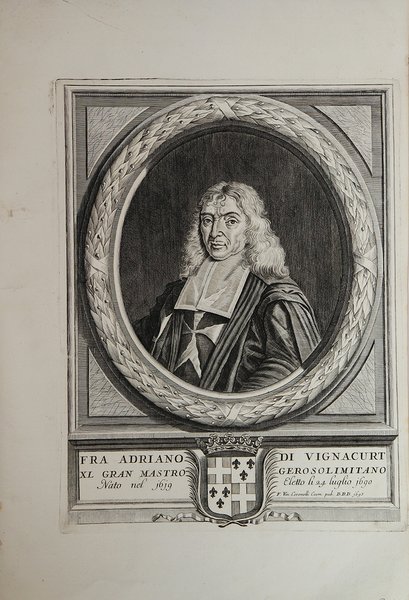 Ritratto del Gran Maestro dell’Ordine in carica ai tempi di Coronelli, racchiuso in una cornice a foglie, realizzato per il suo Corso geografico, una delle più celebri opere del religioso veneziano. Opera tratta dal ' Corso geografico universale, o sia la terra divisa nelle sue parti e subdistinta ne' suoi gran regni. Esposta in tavole geografiche ricorrette et accresciute di tutte le nuove scoperte, ad uso dell'Accademia Cosmografica degli Argonauti dal Padre Maestro Vincenzo Coronelli M. C. Cosmografo della Serenissima Republica di Venetia. Dedicata alla Santità di Nostro Signore Innocenzo XII. P. I. In Venetia, a spese dell'autore. MDCXCII. Coronelli visse un periodo di straordinaria fecondità editoriale a partire dal 1689, quando ebbe la cattedra di geografia presso l'Università alle Procuratie, con la pubblicazione, nel 1690, del primo volume dell'Atlante Veneto. In effetti sotto il nome di ' Atlante Veneto ' va tutta la raccolta di tredici opere composte nell'arco del decennio successivo, dall'Isolario ' allo ' Specchio del mare. In realtà solo alcune di tali opere possono definirsi atlante, e sono di valore molto disuguale, dato che si passa da opere originali e fondamentali come quelle citate o il ' Corso Geografico ' ad opere di compilazione o semplici raccolte di vedute. Il ' Corso Geografico ' uscì in diverse edizioni con numeri diversi di carte - sessantotto tavole nel 1689-92; di centosettantatré tavole nel 1692; duecentosessanta tavole, nel 1694-97 - che venivano vendute anche separatamente, al ritmo di sei carte al mese per due anni. Le carte furono incise tra il 1688 e il 1692 nell'attrezzatissima officina cartografica del convento dei Frari, dove lavoravano anche incisori stranieri. ' Incisione in rame, in ottimo stato di conservazione. Portrait of the Grand Master of the Order in charge at the time of Coronelli, realized for his Corso geografico, one of the most famous works of the Venetian religious. The map is taken from ' Corso geografico universale, o sia la terra divisa nelle sue parti e subdistinta ne' suoi gran regni. Esposta in tavole geografiche ricorrette et accresciute di tutte le nuove scoperte, ad uso dell'Accademia Cosmografica degli Argonauti dal Padre Maestro Vincenzo Coronelli M. C. Cosmografo della Serenissima Republica di Venetia. Dedicata alla Santità di Nostro Signore Innocenzo XII. P. I. In Venetia, a spese dell'autore. MDCXCII. Coronelli lived a period of extraordinary editorial fecundity starting from 1689, when he had the chair of geography at the University at the Procuratie, with the publication, in 1690, of the first volume of the ' Atlante Veneto. Under the name of ' Atlante Veneto ' goes the entire collection of thirteen works composed over the next decade, from the ' Isolario ' to the ' Specchio del mare. ' In reality, only some of these works can be defined as atlas, and are of very unequal value, since we go from original and fundamental works such as those mentioned or the ' Corso Geografico ' to works of compilation or simple collections of views. The ' Corso Geografico ' came out in several editions with different numbers of maps - sixty-eight maps in 1689-92; one hundred and seventy-three maps in 1692; two hundred and sixty maps in 1694-97 - which were also sold separately, at the rate of six a month for two years. The maps were alle engraved between 1688 and 1692 in the well-equipped cartographic workshop of the Frari convent, where foreign engravers also worked. ' Copperplate, in good condition. Cfr.