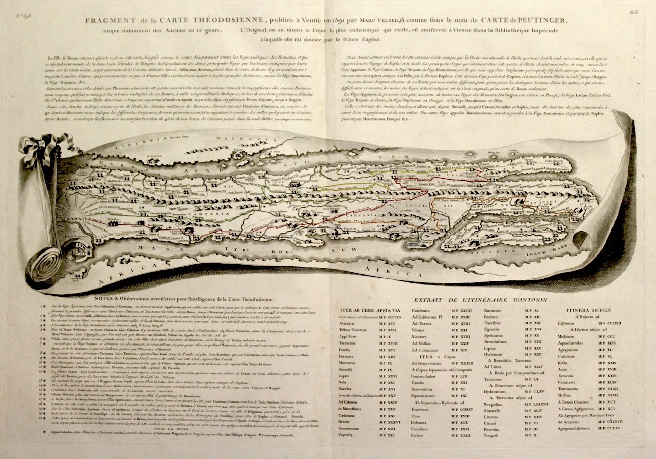 Incisione in rame, 410x597. Bella incisione che raffigura una parte delle tavola Peuntigeriana, l'unico documento cartografico di epoca romana pervenutoci; rispetto all'originale questa è solo la parte relativa al regno di Napoli. Tratta dall'edizione ottocentesca di "Voyage Pittoresque ou description des Royaumes de Naples et de Sicile", in assoluto una delle più belle ed eleganti opere descrittive del regno di Napoli: composta da cinque volumi usciti dal 1781 al 1786, rappresentò un enorme sforzo economico e tipografico, ripagato peraltro da un successo enorme di vendite, diventando il modello tipografico su cui si basarono molte posteriori opere di viaggio. Bell'esemplare con ampi margini.