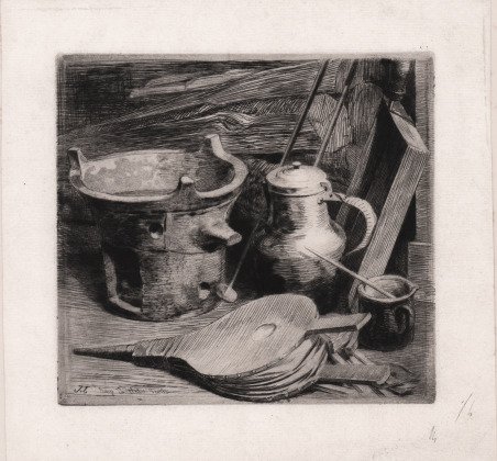 Acquaforte e puntasecca, su carta vergata, 1863. Firmata sulla lastra in basso a sinistra, dove è anche stampato l'indirizzo di Alfred Cadart. Numerata a matita in basso a destra: 1/6. Una superba prova ricca di contrasto, con il margine completo. Posata su cartone contemporaneo, in ottime condizioni. ' Jules-Ferdinand Jacquemart, noto anche come Jules Jacquemart, nato il 7 settembre 1837 a Parigi e morto nella stessa città il 26 settembre 1880, è stato un incisore, acquerellista e illustratore francese, particolarmente noto per le sue incisioni. Nel 1862 Jacquemart fu uno dei membri fondatori della Société des Aquafortistes che, su impulso dell'editore Alfred Cadart, fece della distribuzione sistematica delle stampe il suo principale obiettivo. Dal 1859 fino alla sua morte, fu un collaboratore regolare della Gazette des beaux-arts. ' Come molti altri illustratori, Jules Jacquemart visse l’arrivo della fotografia. Egli fu uno dei suoi più determinati oppositori perché agli incisori veniva richiesta una precisione sempre maggiore nella litografia o anche nell'acquaforte. La fotografia, i cui risultati sono spesso ammirevoli, li costringeva a emulare l’effetto; tuttavia, l'aquafortista Jules Jacquemart, avversario giurato e emulatore quasi forzato della fotografia, ne offre l’esempio più spettacolare di imiazione. ' Jules fu anche uno dei primi promotori e collezionisti di stampe giapponesi, insieme al pittore James Tissot e al curatore del Museo del Louvre Villot. Fece parte del movimento giapponese. Con Philippe Burty, Henri Fantin-Latour e Félix Bracquemond, formò una società per studiare l'arte e la cultura giapponese. Nel suo profondo saggio su Jacquemart, James A. Ganz sottolinea l'influenza significativa che la Société des Aquafortistes e le sue pubblicazioni ebbero sul lavoro di Vincent van Gogh (vedi James A. Ganz, "Jules Jacquemart: Forgotten Printmaker of the Nineteenth Century", Philadelphia Museum of Art Bulletin, vol. 87, no. 370 (primavera 1991), pp. 14-16). Un'opera molto rara. Bibliografia Beraldi 342-347; L.G. 344. Etching and drypoint, on ivory-coloured wove paper, 1863. Signed on plate at lower left, where is also printed the address of Alfred Cadart. Numbered in pencil at lower right: 1/6. A superb, contrasting proof impression, with the full margin. Laid down on contemporary cardboard, in excellent condition. ' Jules-Ferdinand Jacquemart, also known as Jules Jacquemart, born on September 7, 1837 in Paris, and died in the same city on September 26, 1880, was a French engraver, watercolorist and illustrator, particularly known for his etchings. ' In 1862 Jacquemart was one of the founding members of the Société des Aquafortistes who, at the instigation of the publisher, Alfred Cadart, made the systematic distribution of prints their main objective. From 1859 until his death, he was a regular contributor to the Gazette des beaux-arts. Like many other illustrators, Jules Jacquemart experienced the arrival of photography. He was one of its most determined opponents because an ever greater precision is required of engravers in lithography or even etching; it is photography that forces them to emulate each other, the results of which are often admirable and of which the aquafortist Jules Jacquemart, sworn adversary and almost forcible emulator of photography, offers the most spectacular example. ' Jules Jacquemart was one of the first promoters and collectors of Japanese prints, along with the painter James Tissot and the curator of the Louvre Museum Villot. He was part of the Japanese movement. With Philippe Burty, Henri Fantin-Latour and Félix Bracquemond, he formed a society to study Japanese art and culture. In his profound essay on Jacquemart, James A. Ganz points to the significant influence the Société des Aquafortistes and its publications had on the work of Vincent van Gogh (see James A. Ganz, “Jules Jacquemart: Forgotten Printmaker of the Nineteenth Century”, Philadelphia Museum of Art Bulletin, vol. 87, no. 370 (Spring 1991), pp. 14–16). ' A very rare work. Bibliografia Beraldi 342-347; L.G. 344. Cfr.