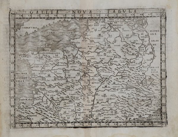 Tratta dalla "Geografia"di Claudio Tolomeo, prima edizione "tascabile" curata da Giacomo Gastaldi e stampata a Venezia da Nicolò Bascarini per Giovanni Battista Pedrezano nel 1548."L’edizione veneta del 1548, curata e aggiornata in formato “tascabile” da Giacomo Gastaldi, uno dei principali cartografi del XVI secolo, registra la prima traduzione del testo (fatta eccezione per la versione toscana in terza rima composta dal Berlinghieri) dal latino al volgare: questo “piccolo” Tolomeo, rifacentesi ancora in parte al lavoro del Münster e comprendente 60 carte (26 tolemaiche e 34 moderne), rappresentava all’epoca il più completo e aggiornato atlante del mondo. Gastaldi per primo aggiunse cinque mappe regionali del continente americano, fra le quali anche una carta separata del Sud America.Una novità concerneva anche la disposizione delle carte: mentre nei precedenti Tolomei cinquecenteschi le carte moderne erano collocate separatamente dopo quelle tolemaiche, nell’edizione del 1548 ogni carta moderna è inserita nelle serie tolemaiche dopo la corrispondente o la più vicina mappa antica. Le tavole stesse, a dispetto della loro piccola dimensione, sono importanti anche sotto il profilo storico, poiché le carte di tutte le successive edizioni italiane cinquecentesche di Tolomeo derivano sostanzialmente da queste" [cfr. Fabio Fatichenti, Specificità, fortuna e auctoritas del canone tolemaico p. 70, in Bifolco-Ronca, Cartografia e Topografia Italiana del XVI secolo, Catalogo ragionato delle opera a stampa (2018)]. Incisione in rame in ottimo stato di conservazione. Rara. Tratta dalla "Geografia"di Claudio Tolomeo, prima edizione "tascabile" curata da Giacomo Gastaldi e stampata a Venezia da Nicolò Bascarini per Giovanni Battista Pedrezano nel 1548."L’edizione veneta del 1548, curata e aggiornata in formato “tascabile” da Giacomo Gastaldi, uno dei principali cartografi del XVI secolo, registra la prima traduzione del testo (fatta eccezione per la versione toscana in terza rima composta dal Berlinghieri) dal latino al volgare: questo “piccolo” Tolomeo, rifacentesi ancora in parte al lavoro del Münster e comprendente 60 carte (26 tolemaiche e 34 moderne), rappresentava all’epoca il più completo e aggiornato atlante del mondo. Gastaldi per primo aggiunse cinque mappe regionali del continente americano, fra le quali anche una carta separata del Sud America.Una novità concerneva anche la disposizione delle carte: mentre nei precedenti Tolomei cinquecenteschi le carte moderne erano collocate separatamente dopo quelle tolemaiche, nell’edizione del 1548 ogni carta moderna è inserita nelle serie tolemaiche dopo la corrispondente o la più vicina mappa antica. Le tavole stesse, a dispetto della loro piccola dimensione, sono importanti anche sotto il profilo storico, poiché le carte di tutte le successive edizioni italiane cinquecentesche di Tolomeo derivano sostanzialmente da queste" [cfr. Fabio Fatichenti, Specificità, fortuna e auctoritas del canone tolemaico p. 70, in Bifolco-Ronca, Cartografia e Topografia Italiana del XVI secolo, Catalogo ragionato delle opera a stampa (2018)]. Incisione in rame in ottimo stato di conservazione. Rara. Cfr. Fabio Fatichenti, Specificità, fortuna e auctoritas del canone tolemaico p. 70, in Bifolco-Ronca, Cartografia e Topografia Italiana del XVI secolo, Catalogo ragionato delle opera a stampa p. 108.