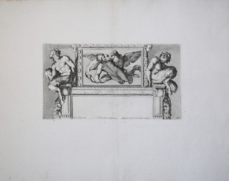 Tavola 20 della serie ' Galeria nel Palazzo Farnese in Roma.del Sereniss. Duca di Parma etc. dipinta da Annibale Carracci intagliata da Carlo Cesio, pubblicata da François Collignon nel 1657, raffigurante gli affreschi realizzati da Annibale Carracci per la Galleria Farnese. L’opera consiste in 44 incisioni all’acquaforte realizzate nella stessa direzione degli affreschi del Carracci. La fama di queste acqueforti, delle quali Cesi realizzò anche una controprova, si deve alla loro fedeltà agli originali. Furono molto apprezzate nonostante la freddezza che spesso questa fedeltà comportava. Dopo la prima stesura, vennero infatti replicate in ben altre cinque edizioni. ' Magnifica prova, impressa su carta vergata, pieni margini, in ottimo stato di conservazione. Esemplare di primo stato con l’indirizzo di Collignon. Carlo Cesio (Antrodoco 1626 - Rieti 1687) è stato un pittore e incisore. Dopo la sua educazione a Rieti, alla fine degli anni ’40 del 1600, si trasferì a Roma dove divenne apprendista di Pietro da Cortona il quale lo presentò a molti mecenati, compresa la Regina Cristina di Svezia e il Cardinal Decio Azzolini. Inoltre, il maestro sostenne la candidatura dell’allievo per l’ammissione alla Accademia di S. Luca nel 1651. La serie di Carlo Cesio (o Cesi) costituisce la prima traduzione grafica italiana di tale ciclo di affreschi. La prima edizione di questa serie venne pubblicata a Roma prima del 1657 e ogni stampa presenta l'indirizzo del Collignon e un numero arabo di serie; la seconda edizione risale sempre al 1657 e si differenza dalla prima solo per l'inserimento di uno scritto intitolato "Argomento della Galeria Farnese dipinta da Annibale Carracci" pubblicato da Vitale Mascardi. Alla morte del Collignon (Roma 1687), le lastre vennero acquistate da Arnold Van Westerhout che ristampò la serie del Cesi con il proprio indirizzo (secondo stato) al posto di quello del Collignon, eliminò il privilegio e i numeri arabi, introducendo una numerazione romana delle tavole. Seguì un'edizione ove il titolo è accompagnato dalla scritta "In Roma nella libraria di Venenzio Monaldini al Corso". Nella quinta edizione l'indirizzo del Monaldini è stato sostituito da quello di Girolamo Mainardi; la sesta ed ultima edizione venne pubblicata a Roma nel 1753 da Venenzio Monaldini con un nuovo titolo: "Aedium farnesiarum tabulae ab Annibale Carraccio .". Bibliografia Bartsch, ' Le peintre-graveur ' (1803-1821) XXI.109.21-64; Bellini P., ' Carlo Cesio ' in “Italian Masters of the Seventeenth Century (The Illustrated Bartsch, vol. 47, 1983)”, pp. 78-99, nn. 021-064; E. Borea, ' Annibale Carracci e i suoi incisori ' (1986). Plate 20 from the series ' Galeria nel Palazzo Farnese in Roma.del Sereniss. Duca di Parma etc. dipinta da Annibale Carracci intagliata da Carlo Cesio ' an album after the fresco ceiling in the Farnese Gallery by Annibale Carracci, published by François Collignon in 1657. The work consists of 44 etchings made in the same direction as Carracci's frescoes. The fame of these etchings, of which Cesi also made a counterproof, is due to their fidelity to the originals. They were much appreciated despite the coldness that this fidelity often entailed. ' ' After the first edition by Collignon, they were in fact replicated in five other editions. ' Etching, printed on contemporary laid paper, with margins, in very good condition. First state with Collignon imprint. Carlo Cesio (Antrodoco 1626 - Rieti 1687) was an Italian painter and engraver. After his education in Rieti, in the late 1640s Cesi went to Rome, where he became a pupil of Pietro da Cortona, who later introduced him to various patrons, including Queen Christina of Sweden and Cardinal Decio Azzolini, and supported his matriculation at the Accademia di S Luca in 1651. The series by Carlo Cesio (or Cesi) constitutes the first Italian graphic translation of this cycle of frescoes. The first edition of this series was published in Rome before 1657 and each print bears Collignon's address and an Arabic series number. The second edition also dates back to 1657 and differs from the first only in the inclusion of an essay entitled 'Argomento della Galeria Farnese dipinta da Annibale Carracci' published by Vitale Mascardi. Upon Collignon's death (Rome 1687), the plates were purchased by Arnold Van Westerhout who reprinted the Cesi series with his own address (second state) instead of Collignon's, eliminated the privilege and the Arabic numerals, and introduced Roman numbering of the plates. This was followed by an edition where the title is accompanied by the inscription 'In Roma nella libraria di Venenzio Monaldini al Corso'. In the fifth edition, Monaldini's address was replaced by that of Girolamo Mainardi; the sixth and final edition was published in Rome in 1753 by Venenzio Monaldini with a new title: 'Aedium farnesiarum tabulae ab Annibale Carraccio .'. Bibliografia Bartsch, ' Le peintre-graveur ' (1803-1821) XXI.109.21-64; Bellini P., ' Carlo Cesio ' in “Italian Masters of the Seventeenth Century (The Illustrated Bartsch, vol. 47, 1983)”, pp. 78-99, nn. 021-064; E. Borea, ' Annibale Carracci e i suoi incisori ' (1986). Cfr.